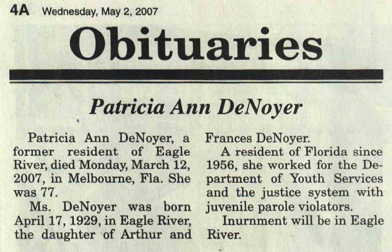 | DeNoyer | Patricia Ann | 17 Apr 1929 | 12 Mar 2007 | V N-R | 02 May 2007 | 4A |