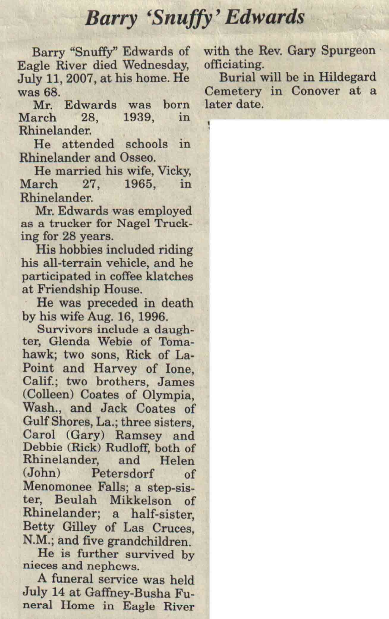 | Edwards | Barry 'Snuffy' | 28 Mar 1939 | 11 Jul 2007 | V N-R | 18 Jul 2007 | 4A |
