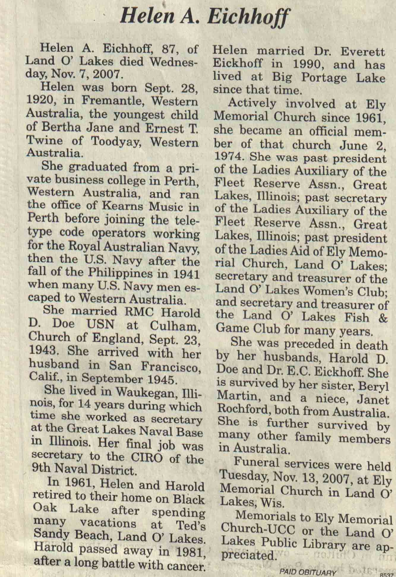 | Eichhoff | Helen A (Twine) | 28 Sep 1920 | 07 Nov 2007 | V N-R | 14 Nov 2007 | 4A |