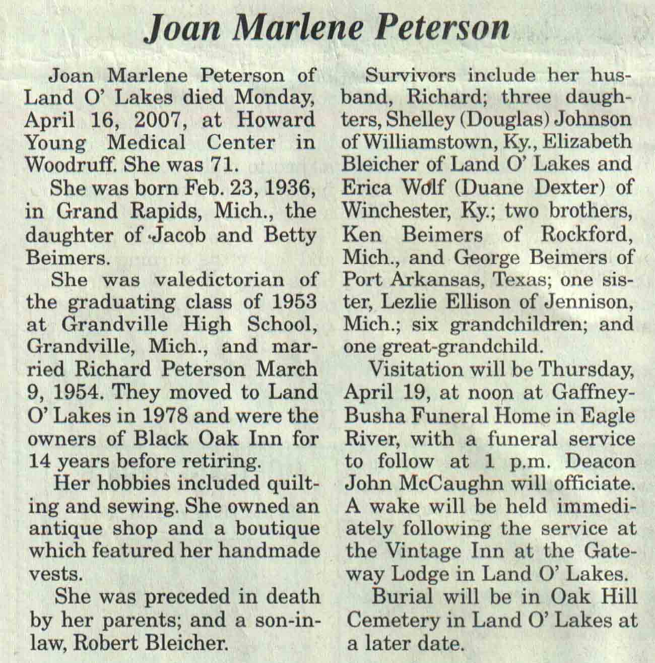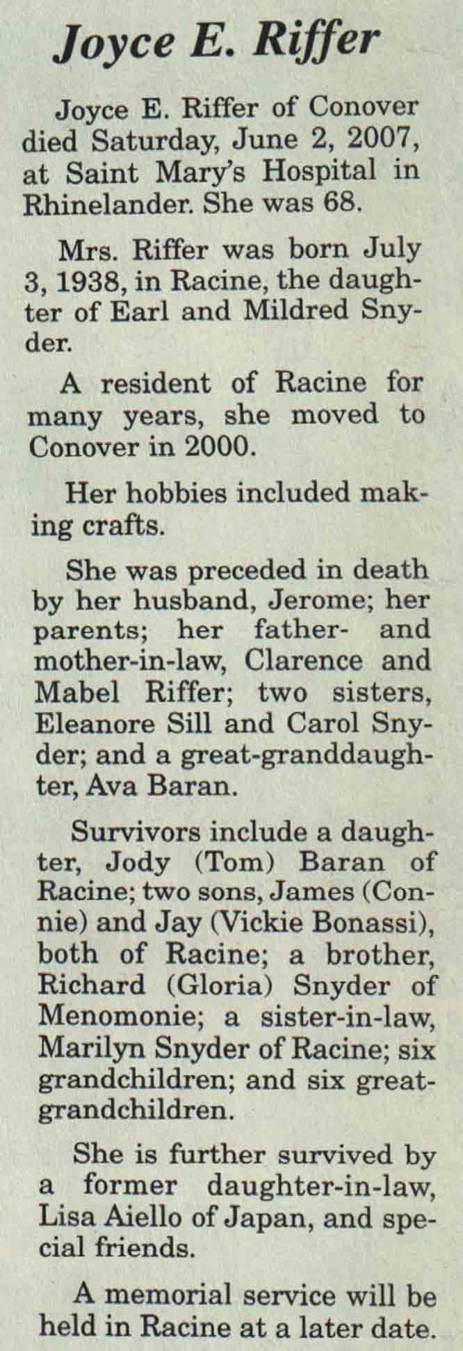 | Dietz | Noella Rae | 26 Dec 1932 | 14 Mar 2007 | V N-R | 21 Mar 2007 | 4A |