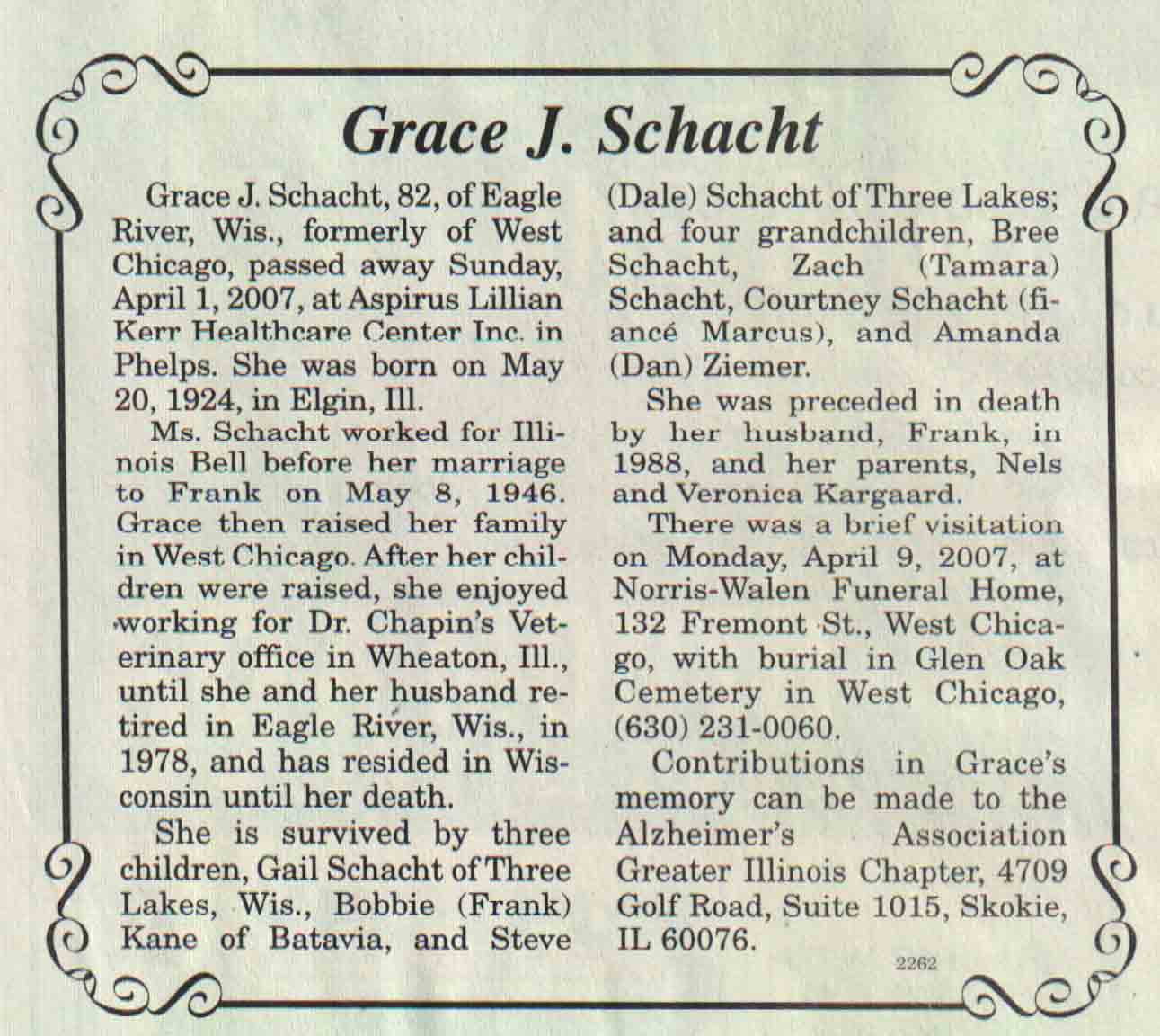 | Dillenbeck | Bernice G (Casey) | 29 May 1923 | 07 Jul 2007 | V N-R | 11 Jul 2007 | 4A |