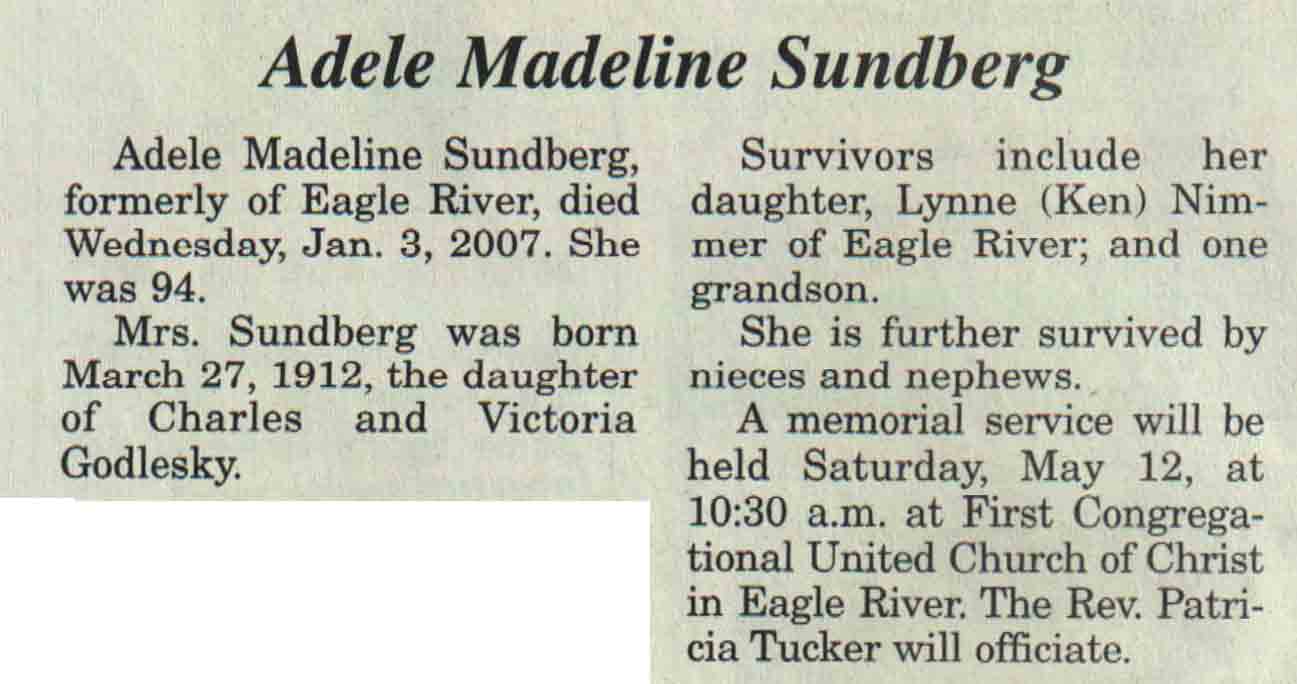 | Sunberg | Adele Madeline (Godlesky) | 27 Mar 1912 | 03 Jan 2007 | V N-R | 09 May 2007 | 4A |