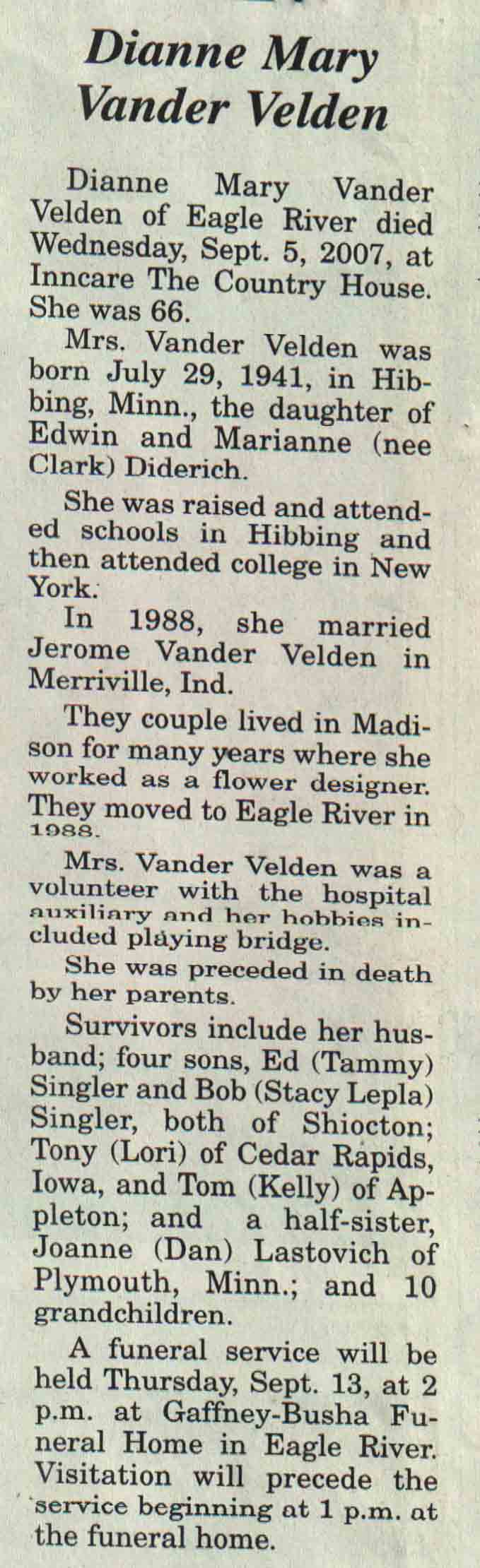 | Vander Velden | Dianne Mary (Diderich) | 29 Jul 1941 | 05 Sep 2007 | V N-R | 12 Sep 2007 | 4A |