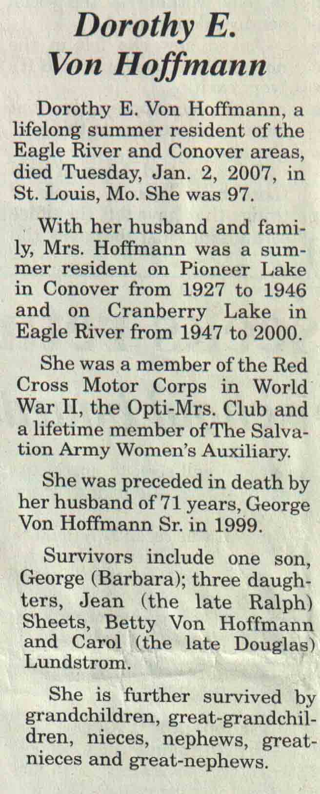 | Von Hoffman | Dorothy E | c 1910 | 02 Jan 2007 | V N-R | 10 Jan 2007 | 4A |