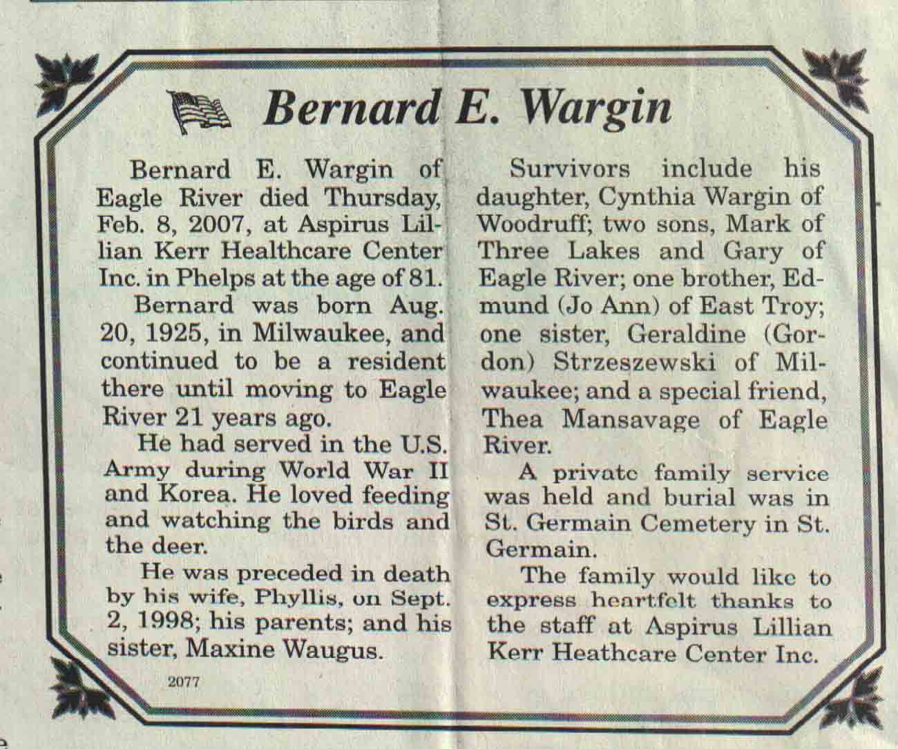 | Wargin | Bernard E | 20 Aug 1925 | 08 Feb 2007 | V N-R | 14 Feb 2007 | 4A |