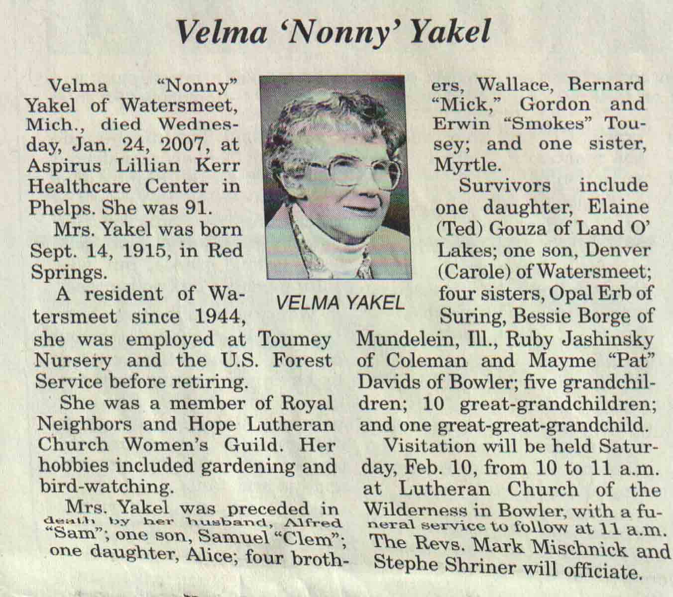 | Yakel | Velma 'Nonny' | 14 Sep 1915 | 24 Jan 2007 | V N-R | 31 Jan 2007 | 4A |