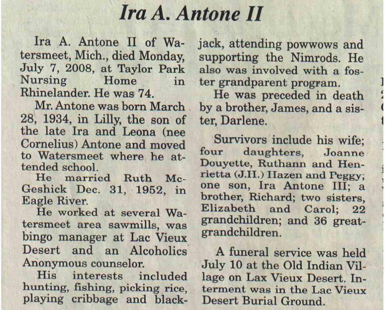 | Antone | Ira A, II | 28 Mar 1934 | 07 Jul 2008 | V N-R | 16 Jul 2008 | 4A |
