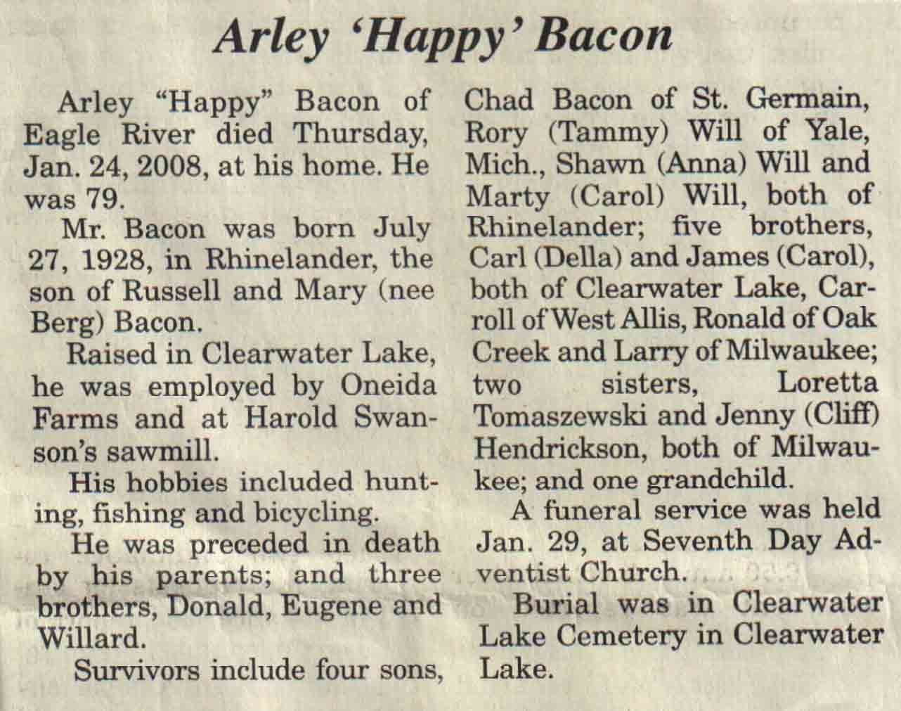 | Bacon | Arley 'Nappy' | 27 Jul 1928 | 24 Jan 2008 | V N-R | 30 Jan 2008 | 4A |