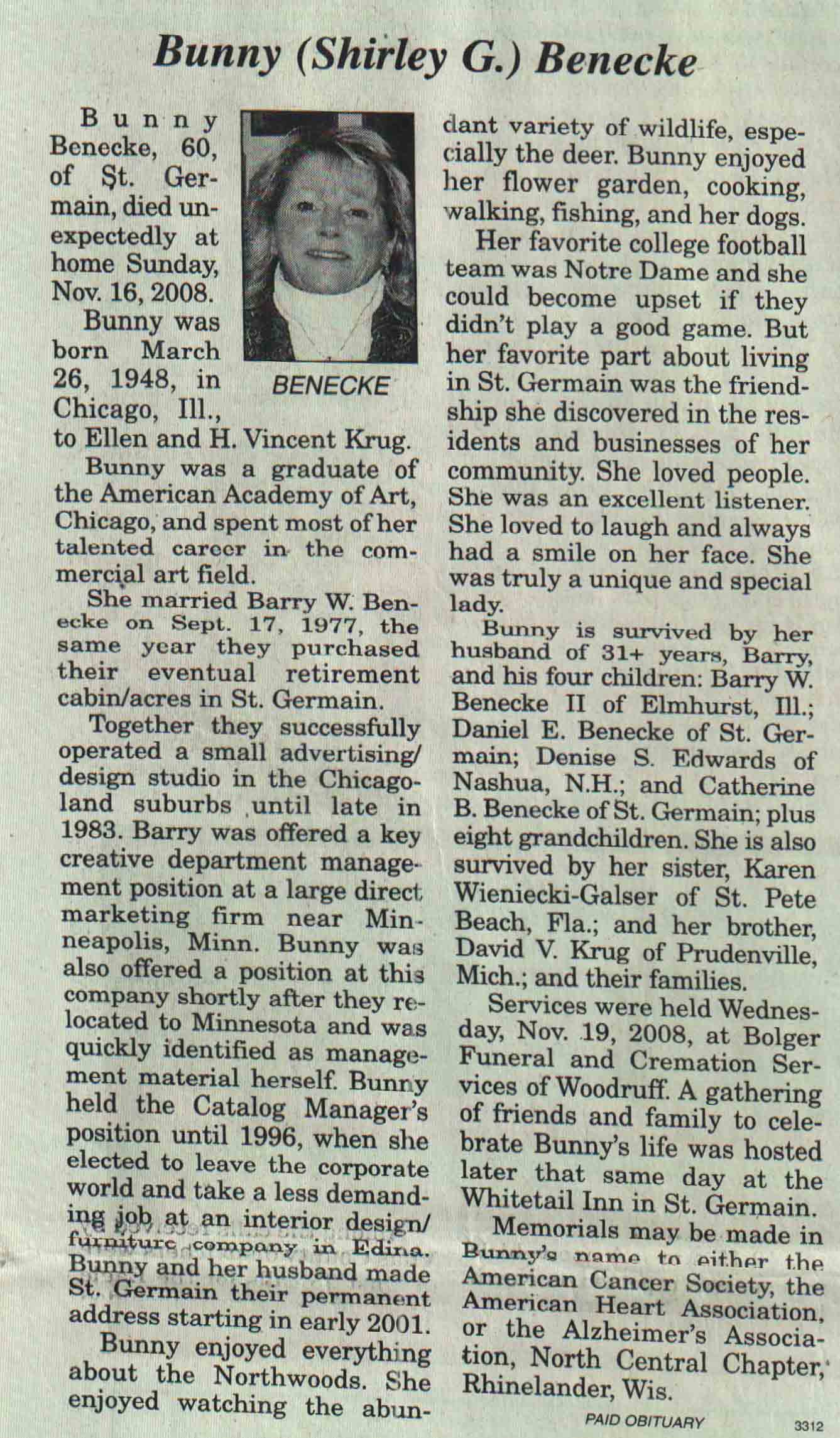 | Benecke | Shirley G 'Bunny' (Krug) | 26 Mar 1948 | 16 Nov 2008 | V N-R | 26 Nov 2008 | 4A |
