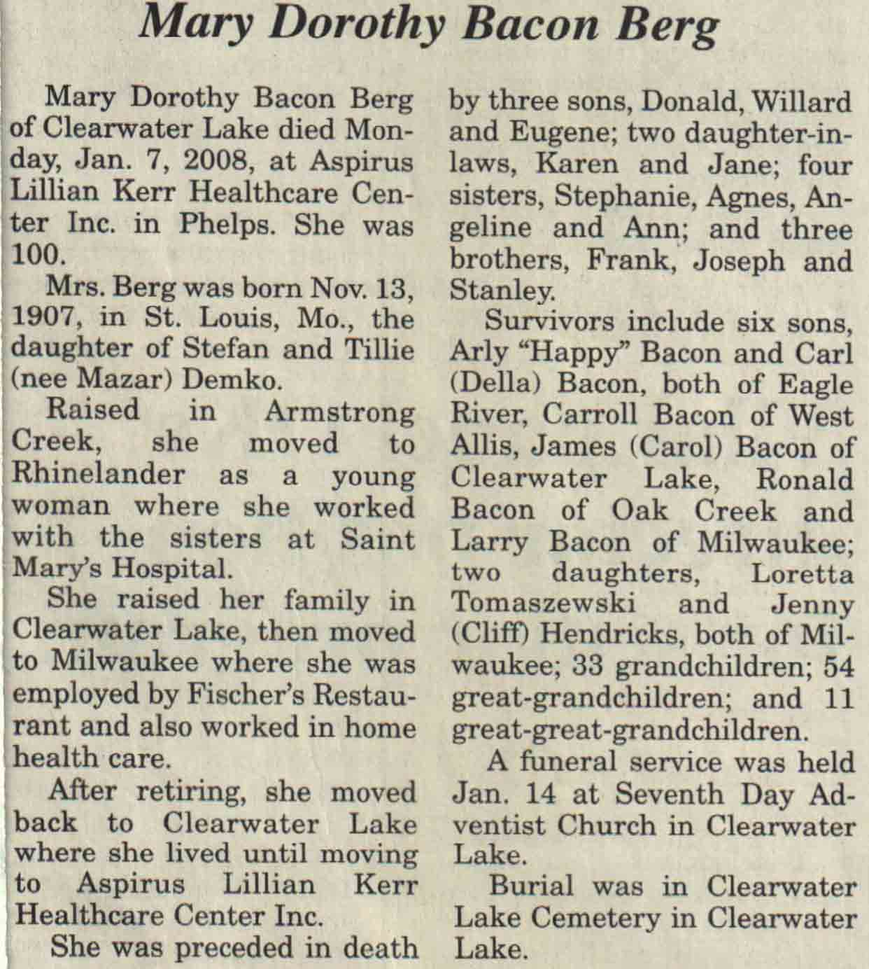 | Berg | Mary Dorothy Bacon (Demko) #2 | 13 Nov 1907 | 07 Jan 2008 | V N-R | 16 Jan 2008 | 6A |