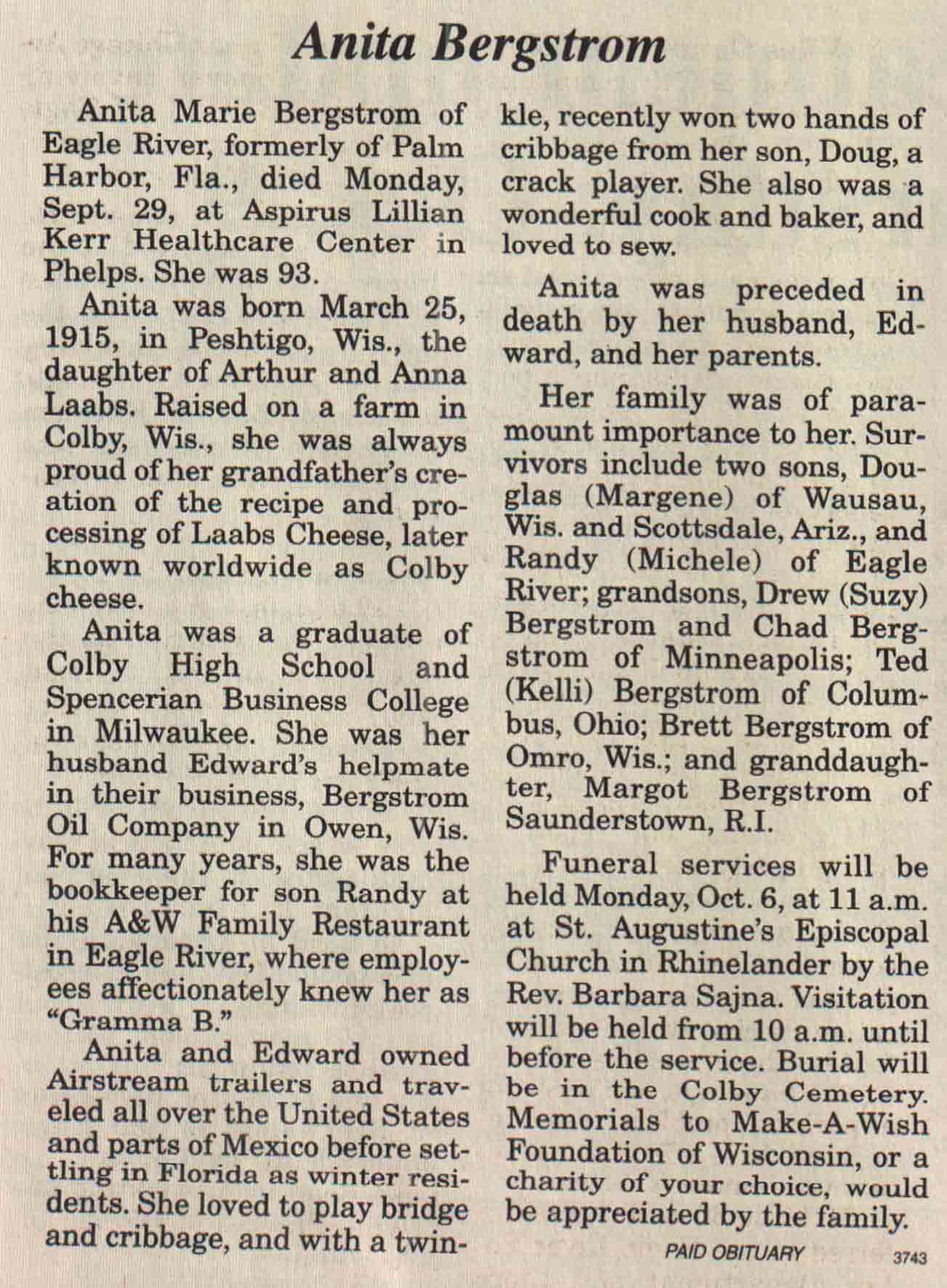 | Bergstrom | Anita (Laabs) | 25 Mar 1915 | 29 Sep 2008 | V N-R | 01 Oct 2008 | 4A |