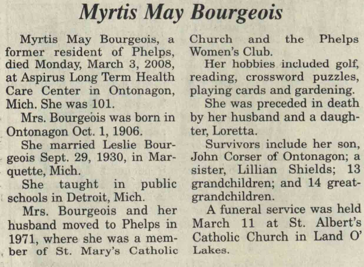 | Bourgeois | Myrtis May | 01 Oct 1906 | 03 Mar 2008 | V N-R | 12 Mar 2008 | 4A |