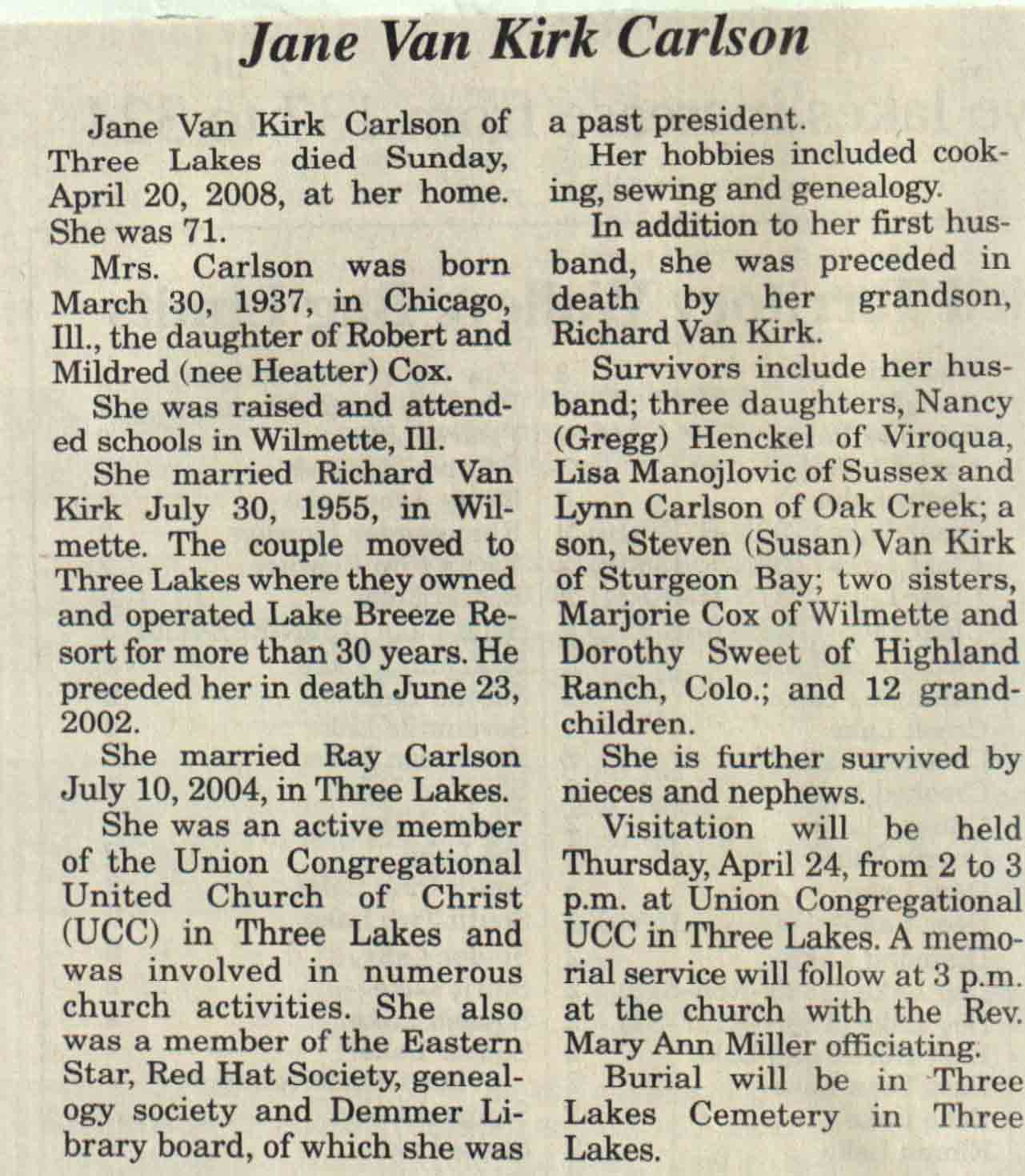 | Carlson | Jane Ann Kirk (Cox) | 30 Mar 1937 | 20 Apr 2008 | V N-R | 23 Apr 2008 | 4A |