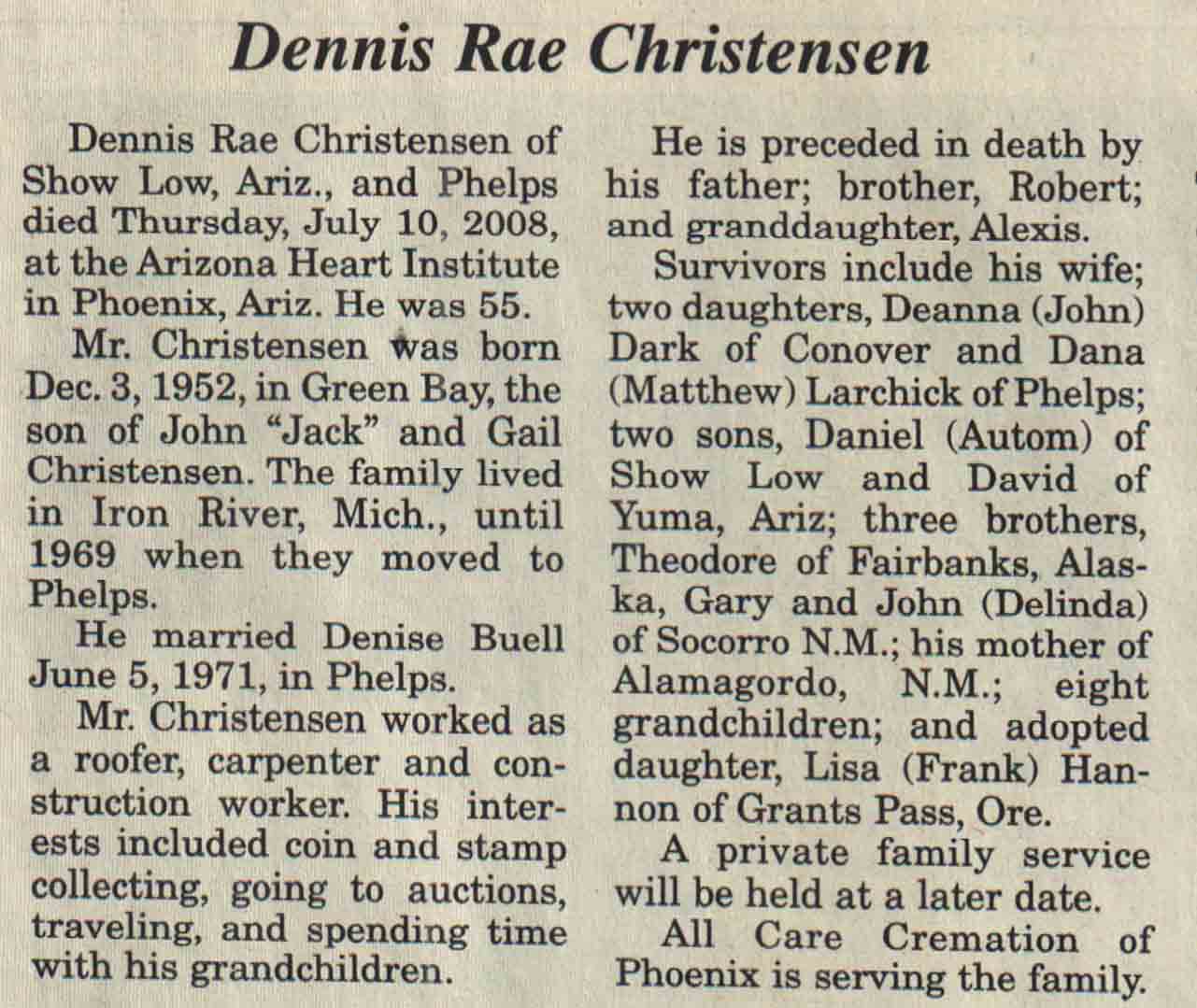 | Christensen | Dennis Rae | 03 Dec 1952 | 10 Jul 2008 | V N-R | 30 Jul 2008 | 4A |