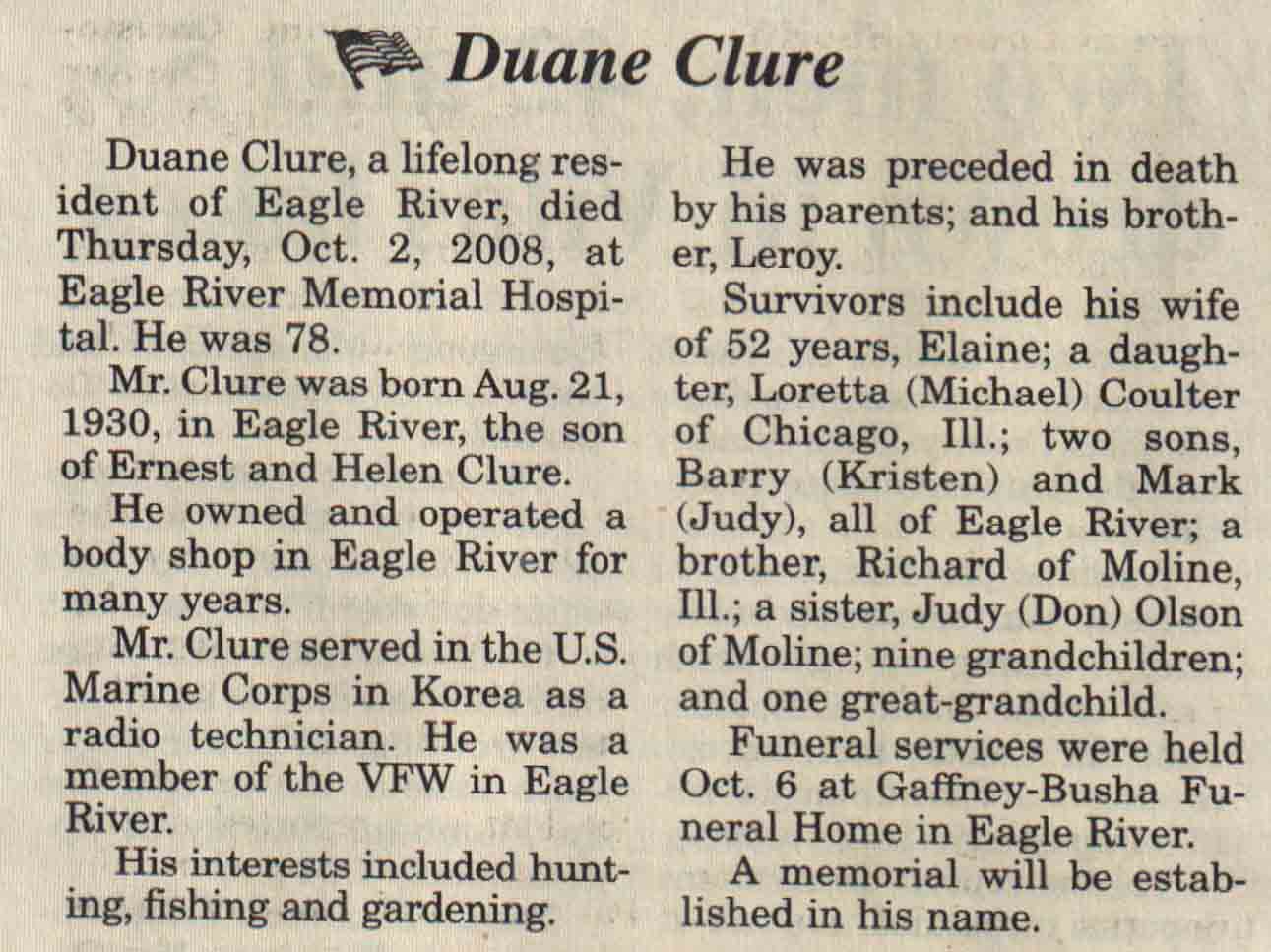 | Clure | Duane | 21 Aug 1930 | 02 Oct 2008 | V N-R | 08 Oct 2008 | 4A |