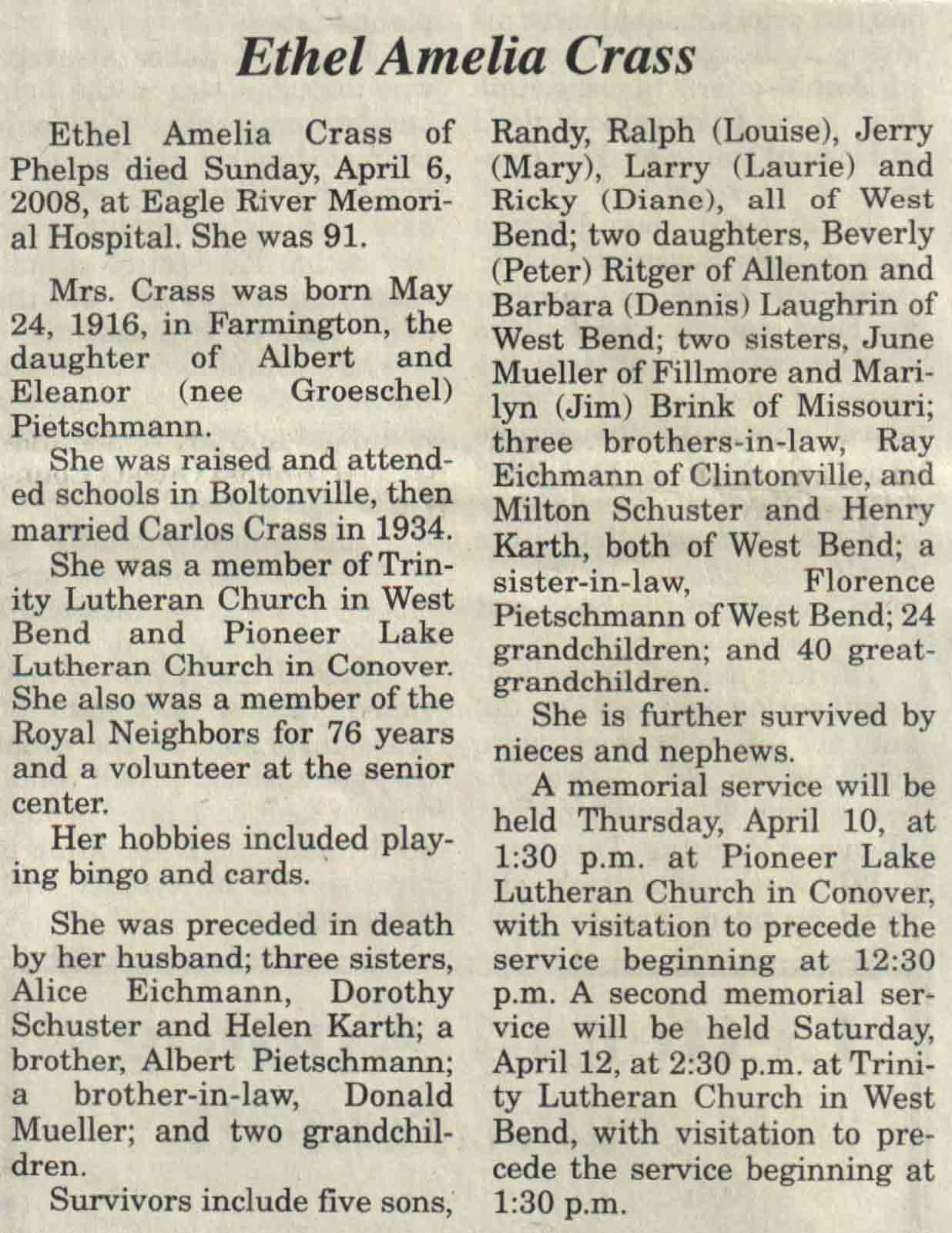 | Crass | Ethel Amelia (Groeschel) | 24 May 1916 | 06 Apr 2008 | V N-R | 09 Apr 2008 | 4A |