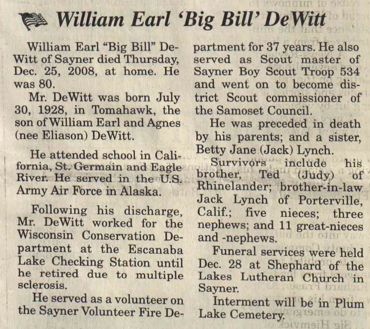 | DeWitt | William Earl 'Big Bill' | 30 Jul 1928 | 25 Dec 2008 | V N-R | 31 Dec 2008 | 4 |