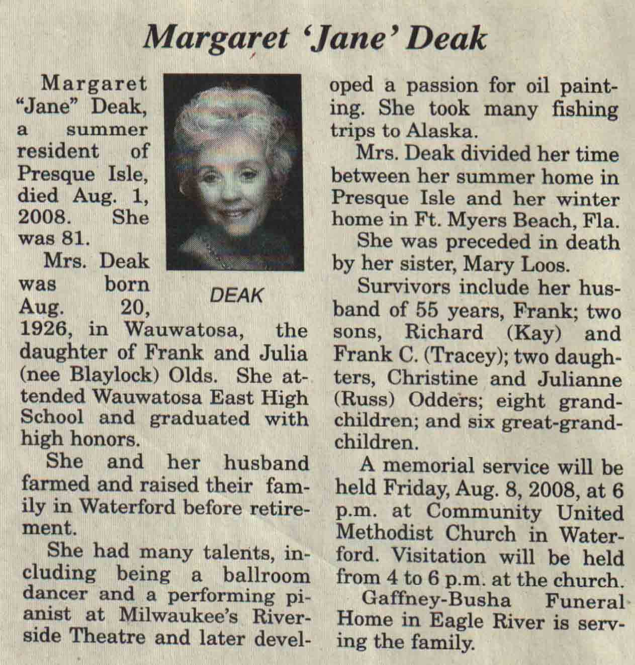 | Deak | Margaret 'Jane' (Olds) | 20 Aug 1926 | 01 Aug 2008 | V N-R | 06 Aug 2008 | 4A |