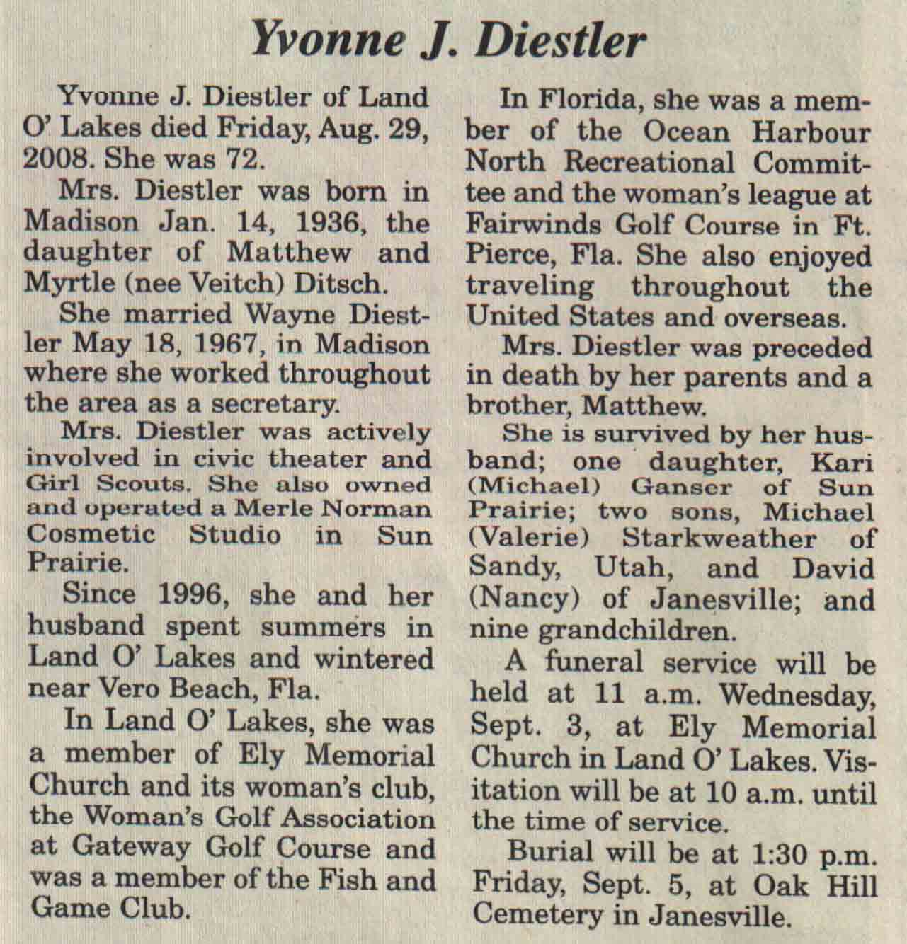 | Diestler | Yvonne J (Ditsch) | 14 Jan 1936 | 29 Aug 2008 | V N-R | 03 Sep 2008 | 4A |