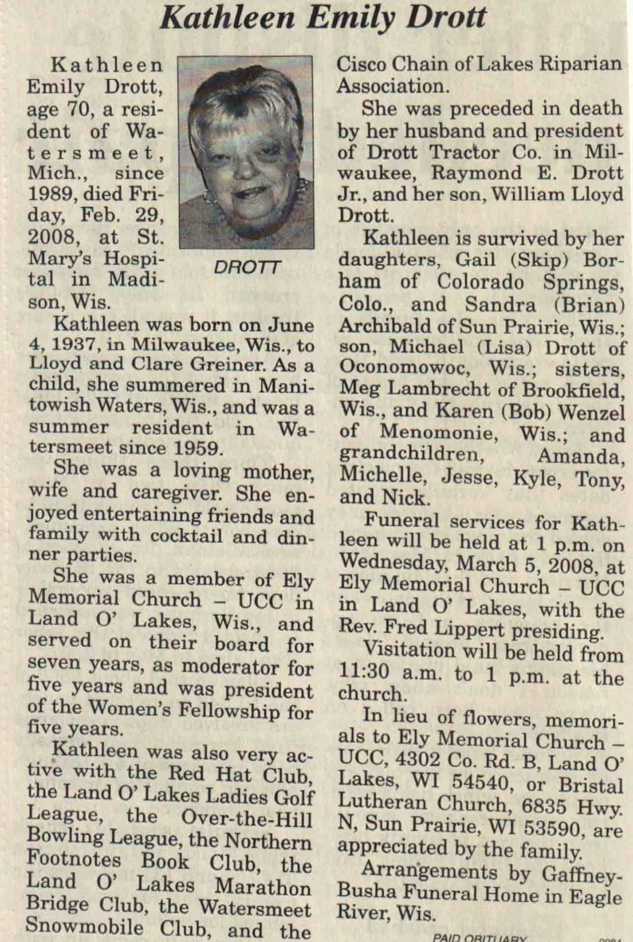 | Drott | Kathleen Emily (Greiner) | 04 Jun 1937 | 29 Feb 2008 | V N-R | 05 Mar 2008 | 4A |