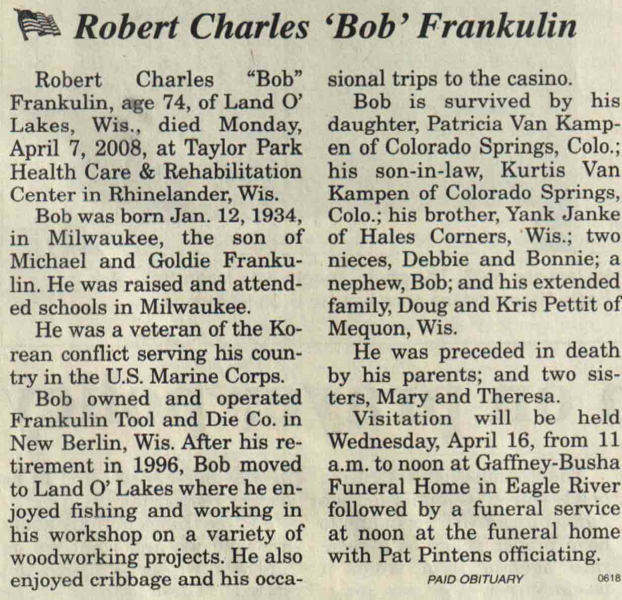 | Frankulin | Robert Charles 'Bob' | 12 Jan 1934 | 07 Apr 2008 | V N-R | 16 Apr 2008 | 4A |