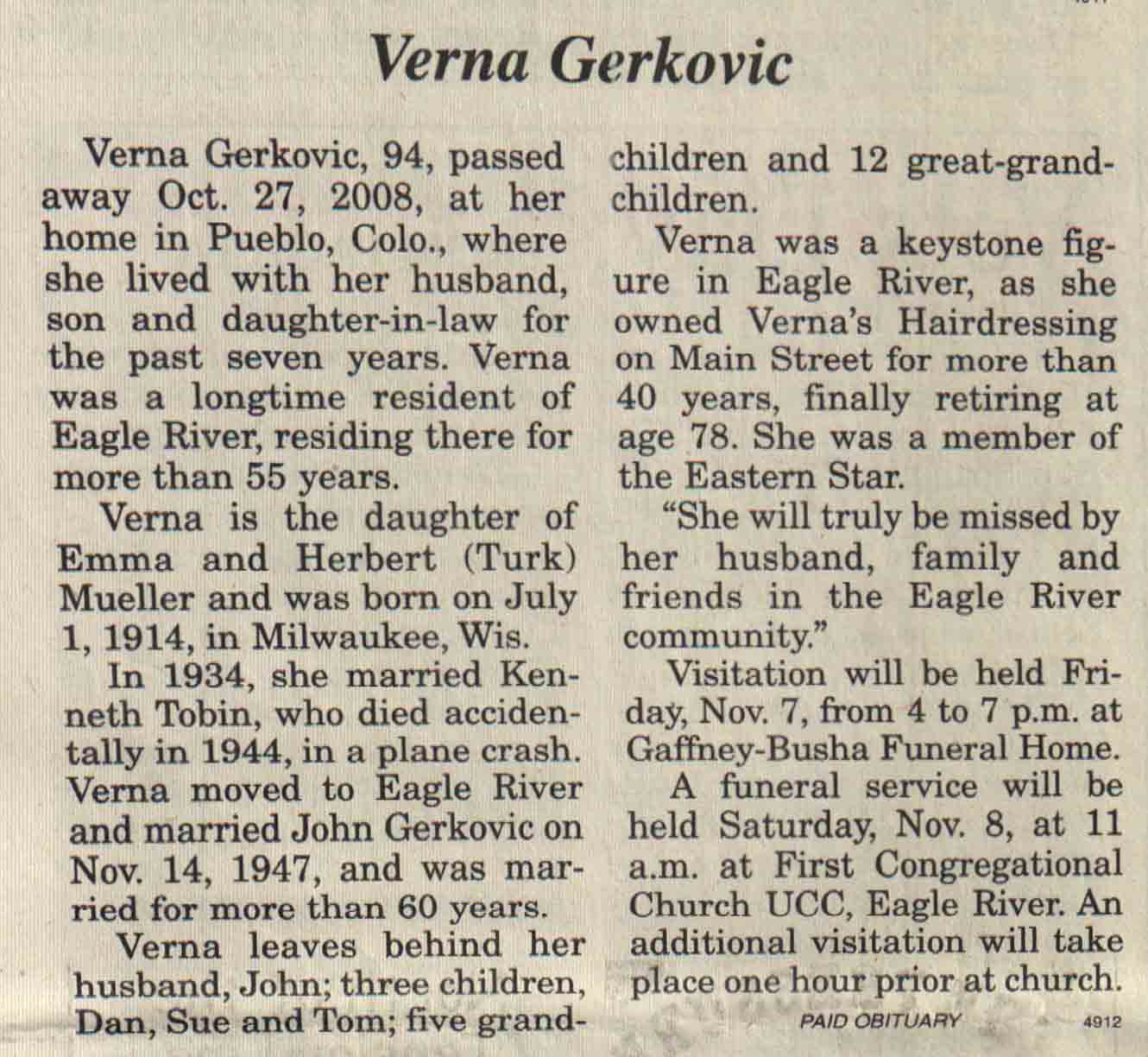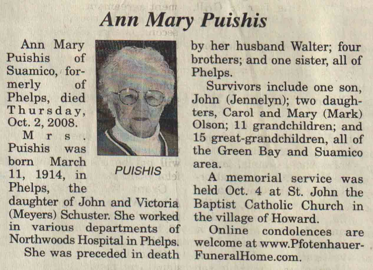 | Puishis | Ann Mary (Schuster) | 11 Mar 1914 | 02 Oct 2008 | V N-R | 15 Oct 2008 | 4A |