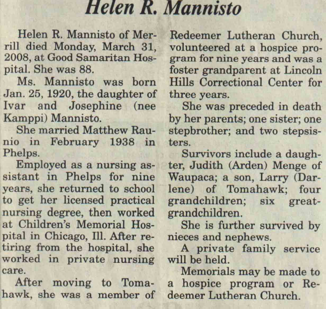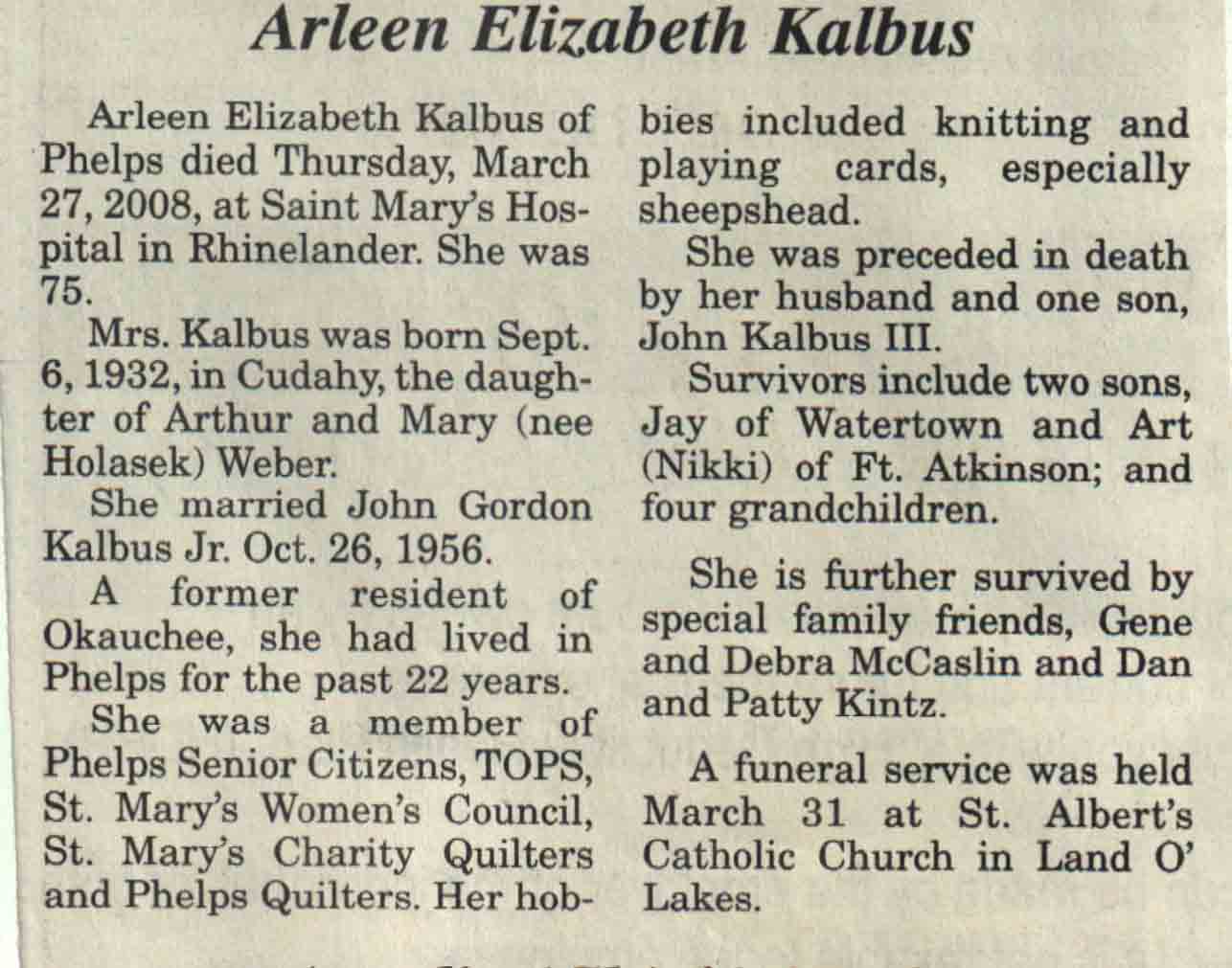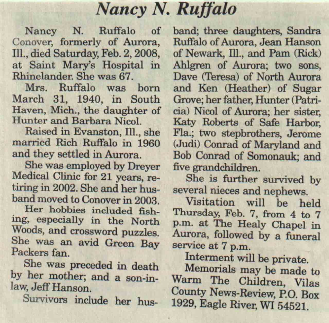 | Ruffalo | Nancy N (Nicol) | 31 Mar 1940 | 02 Feb 2008 | V N-R | 06 Feb 2008 | 4A |