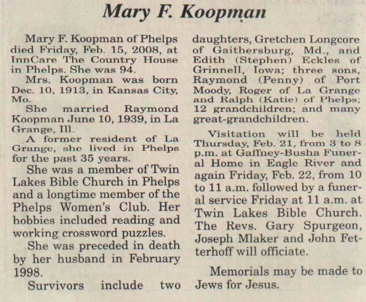 | Surplice | Frances L Ott 'Buddy' (Bentzin) | 08 Mar 1912 | 05 Feb 2008 | V N-R | 27 Feb 2008 | 4A |