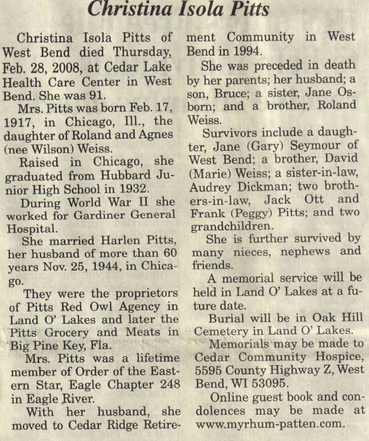 | Wendt | Nora M (Sunderlage) | 28 Mar 1928 | Sep 2008 | V N-R | 24 Sep 2008 | 4A |