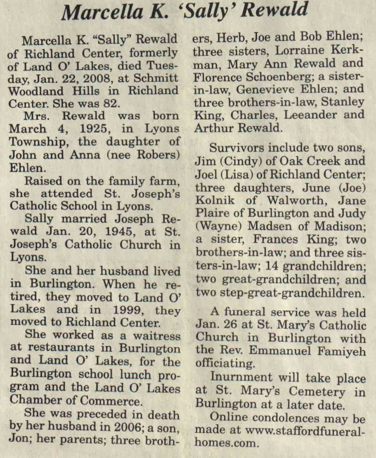 | Rewald | Marcella K 'Sally' (Ehlen) | 04 Mar 1925 | 22 Jan 2008 | V N-R | 30 Jan 2008 | 4A |