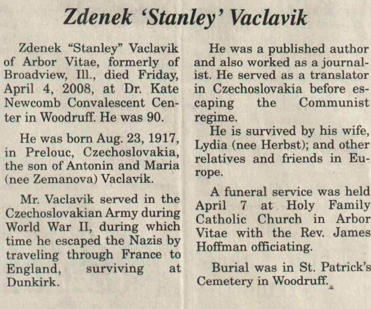 | Vaclavik | Zdenek 'Stanley' | 29 Aug 1917 | 04 Apr 2008 | V N-R | 09 Apr 2008 | 4A |