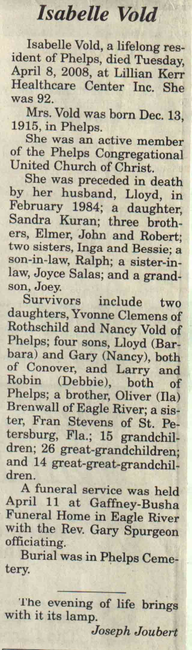| Vold | Isabelle | 13 Dec 1915 | 08 Apr 2008 | V N-R | 16 Apr 2008 | 4A |