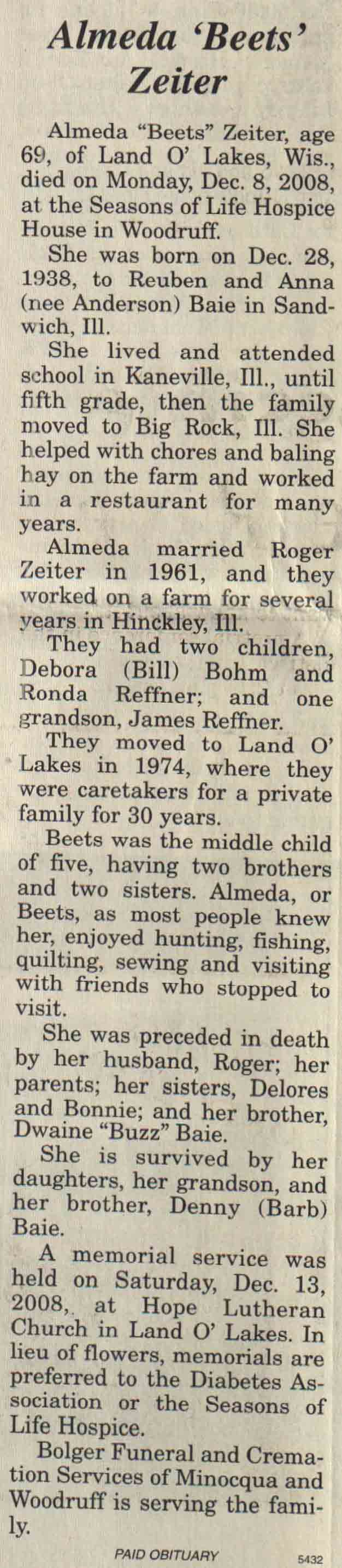| Zeiter | Almeda 'Beets' (Baie) | 28 Dec 1938 | 08 Dec 2008 | V N-R | 17 Dec 2008 | 4A |