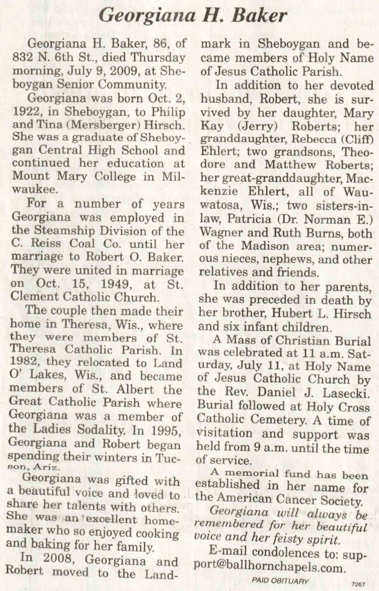 | Baker | Georgiana H (Hirsch) | 02 Oct 1922 | 09 Jul 2009 | V N-R | 15 Jul 2009 | 4A |