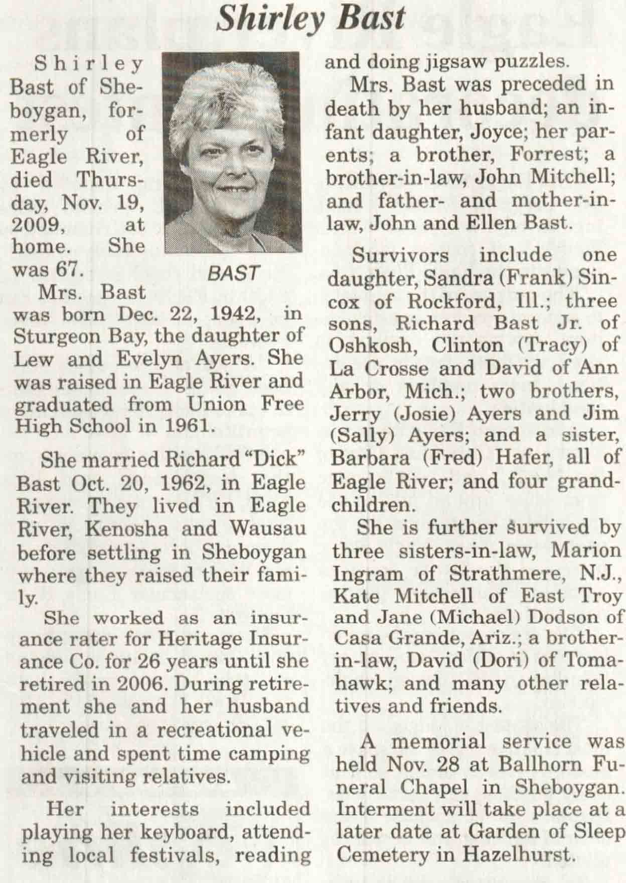| Bast | Shirley (Ayers) | 22 Dec 1942 | 19 Nov 2009 | V N-R | 02 Dec 2009 | 4A |