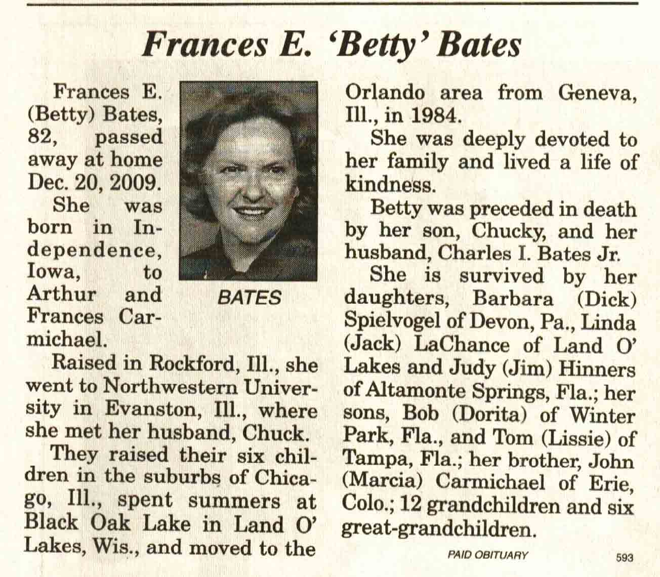 | Bates | Frances E 'Betty' (Carmichael) | c 1928 | 20 Dec 2009 | V N-R | 03 Feb 2010 | 4A |