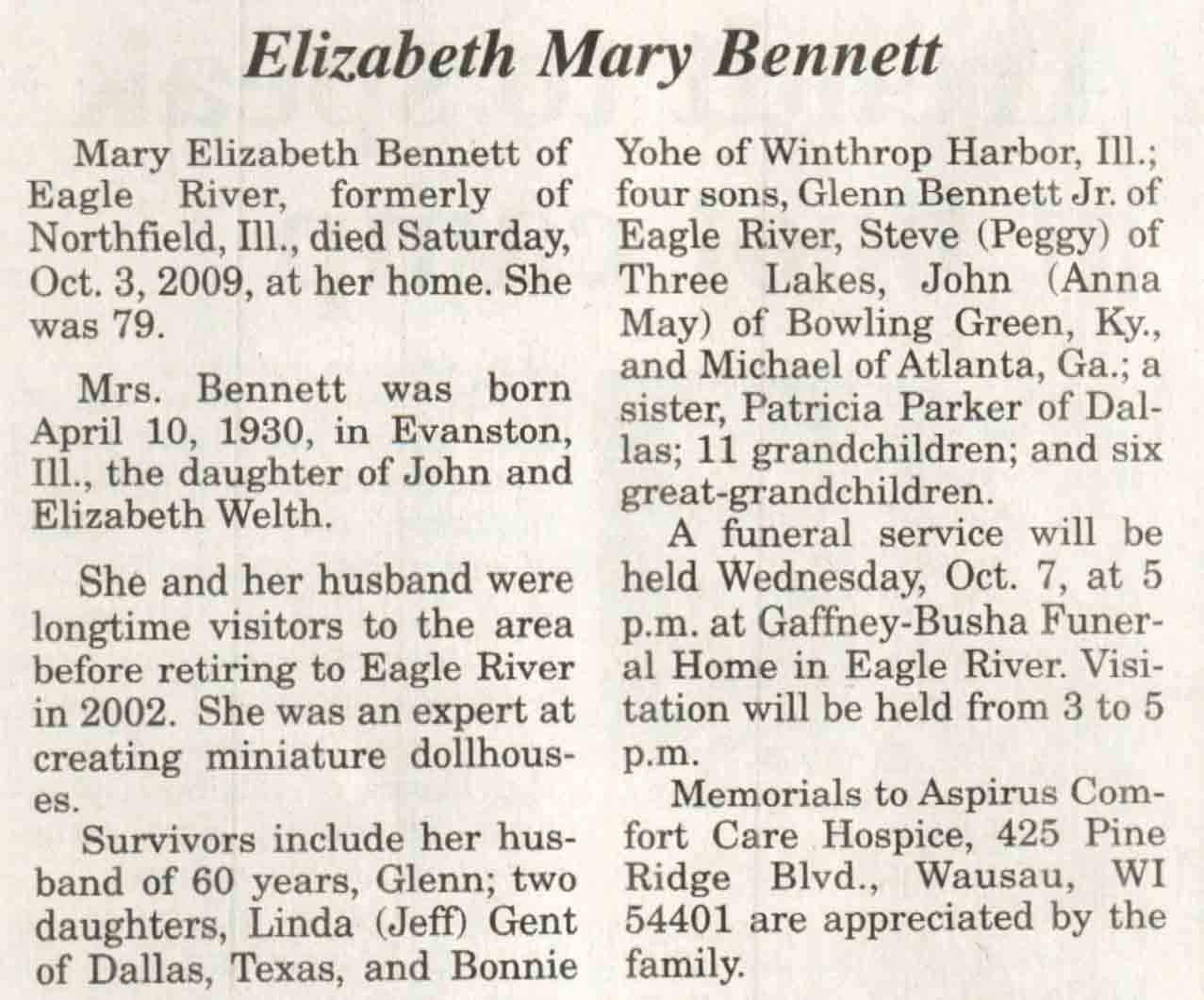| Bennett | Mary Elizabeth (Welth) | 10 Apr 1930 | 03 Oct 2009 | V N-R | 07 Oct 2009 | 4A |