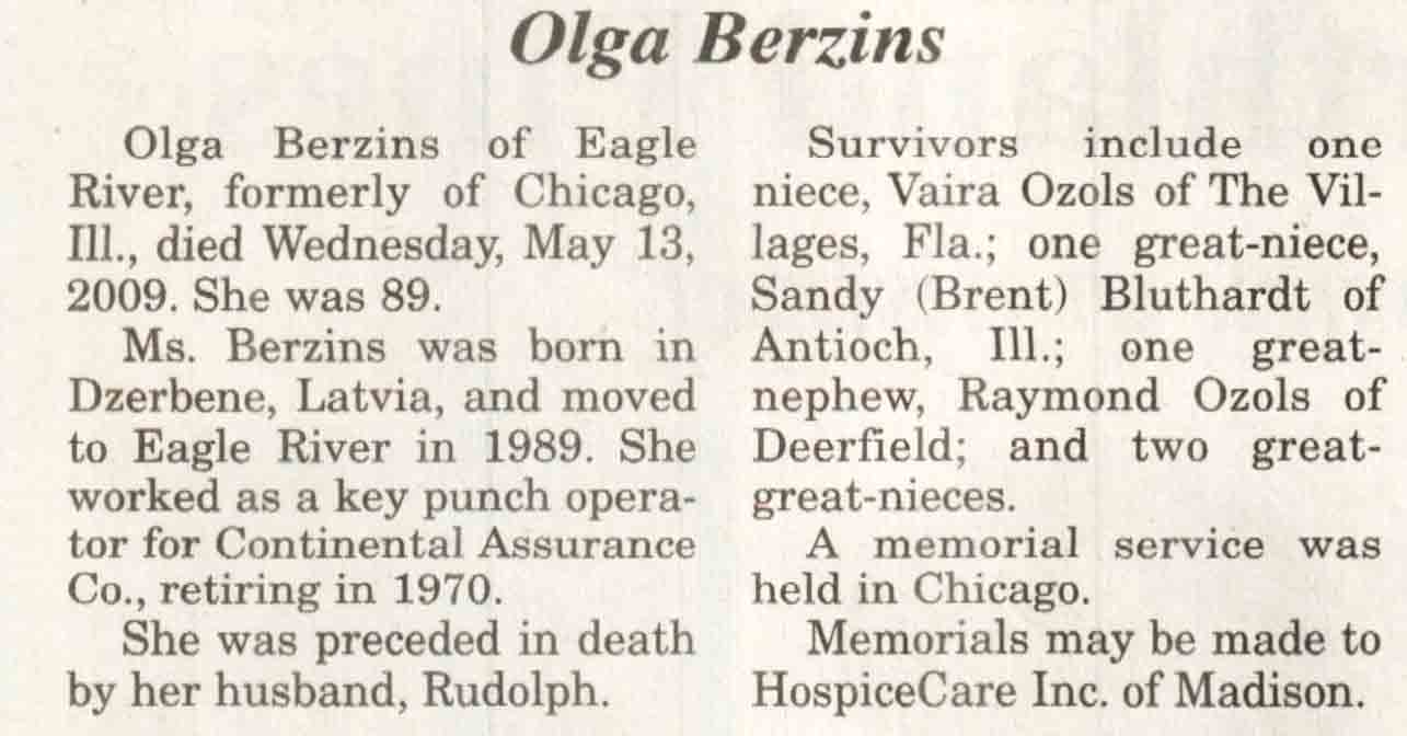 | Berzins | Olga | c 1920 | 13 May 2009 | V N-R | 03 Jun 2009 | 4A |