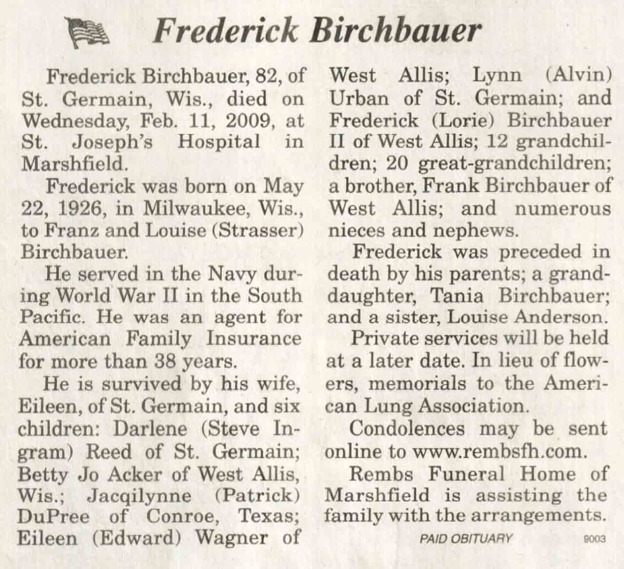 | Birchbauer | Frederick | 22 May 1926 | 11 Feb 2009 | V N-R | 18 Feb 2009 | 4A |