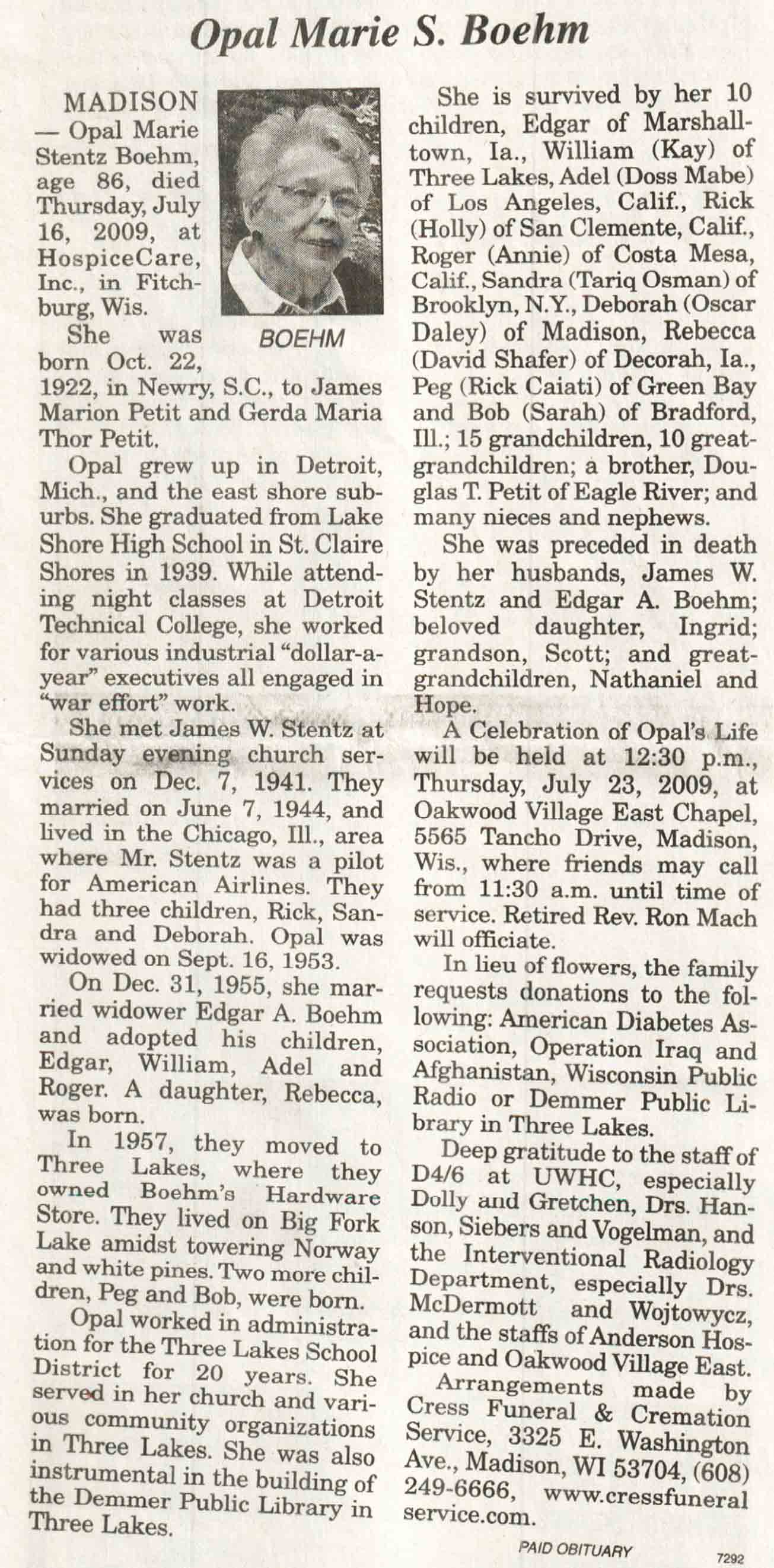 | Boehm | Opal M (Petit) | 22 Oct 1922 | 16 Jul 2009 | V N-R | 22 Jul 2009 | 4A |