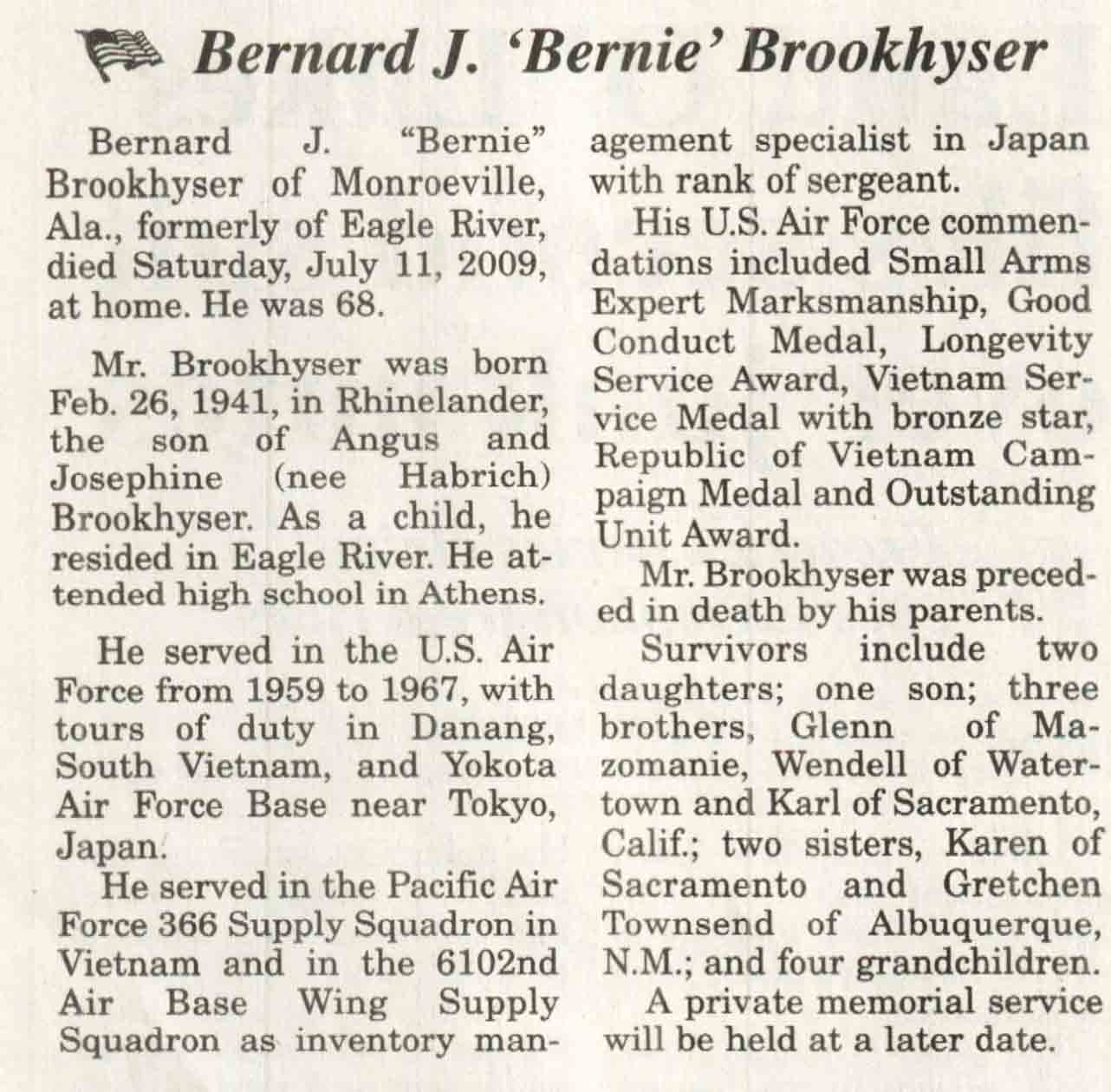 | Brookhyser | Bernard J 'Bernie' | 26 Feb 1941 | 11 Jul 2009 | V N-R | 12 Aug 2009 | 4A |