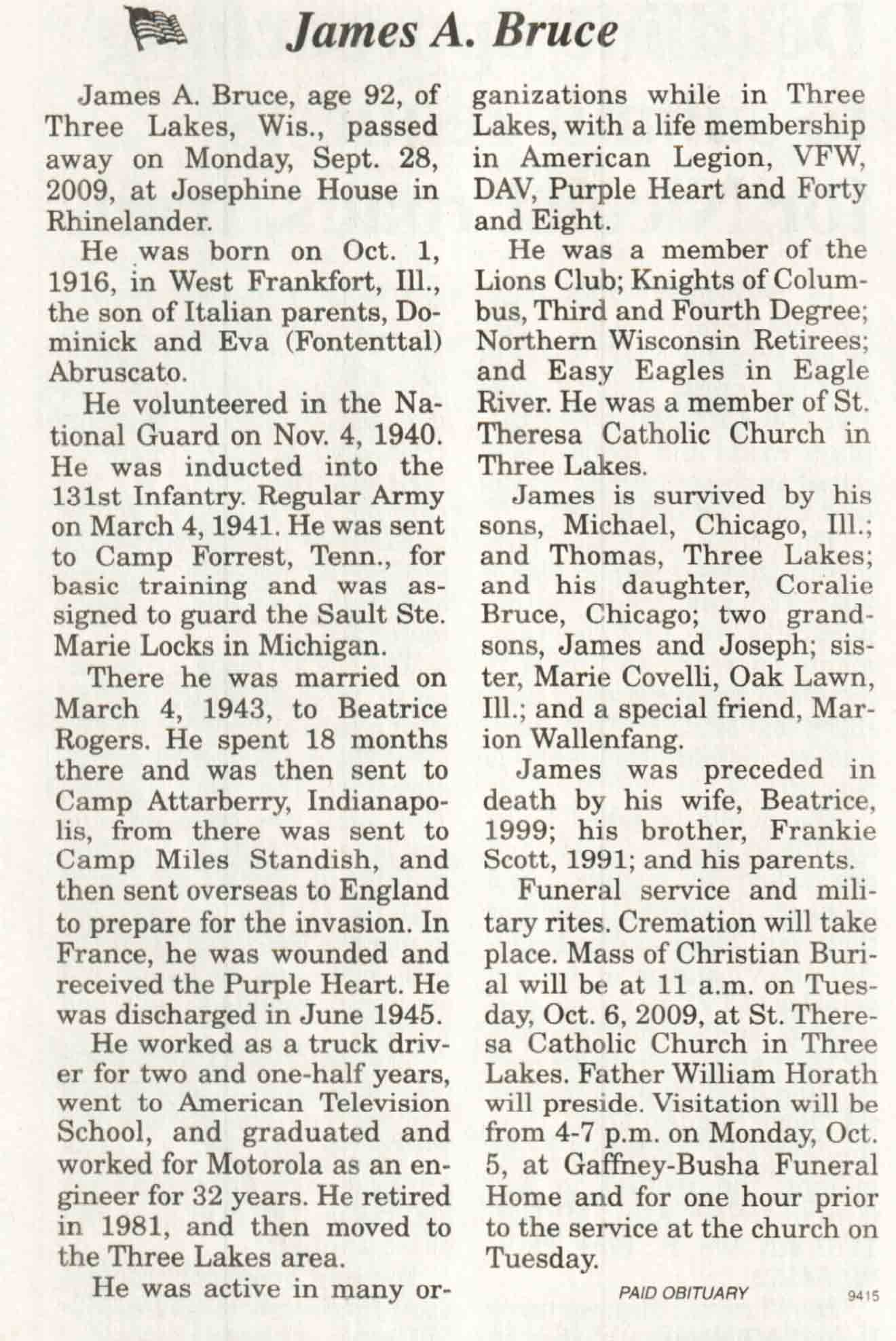 | Bruce | James A | 01 Oct 1916 | 28 Sep 2009 | V N-R | 30 Sep 2009 | 4A |