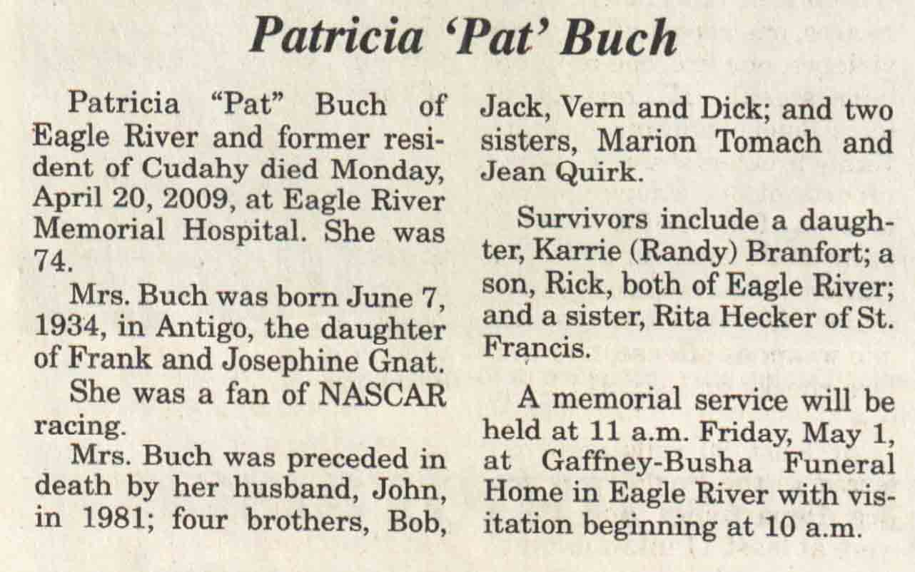 | Buch | Patricia 'Pat' (Gnat) | 07 Jun 1934 | 20 Apr 2009 | V N-R | 29 Apr 2009 | 4 |