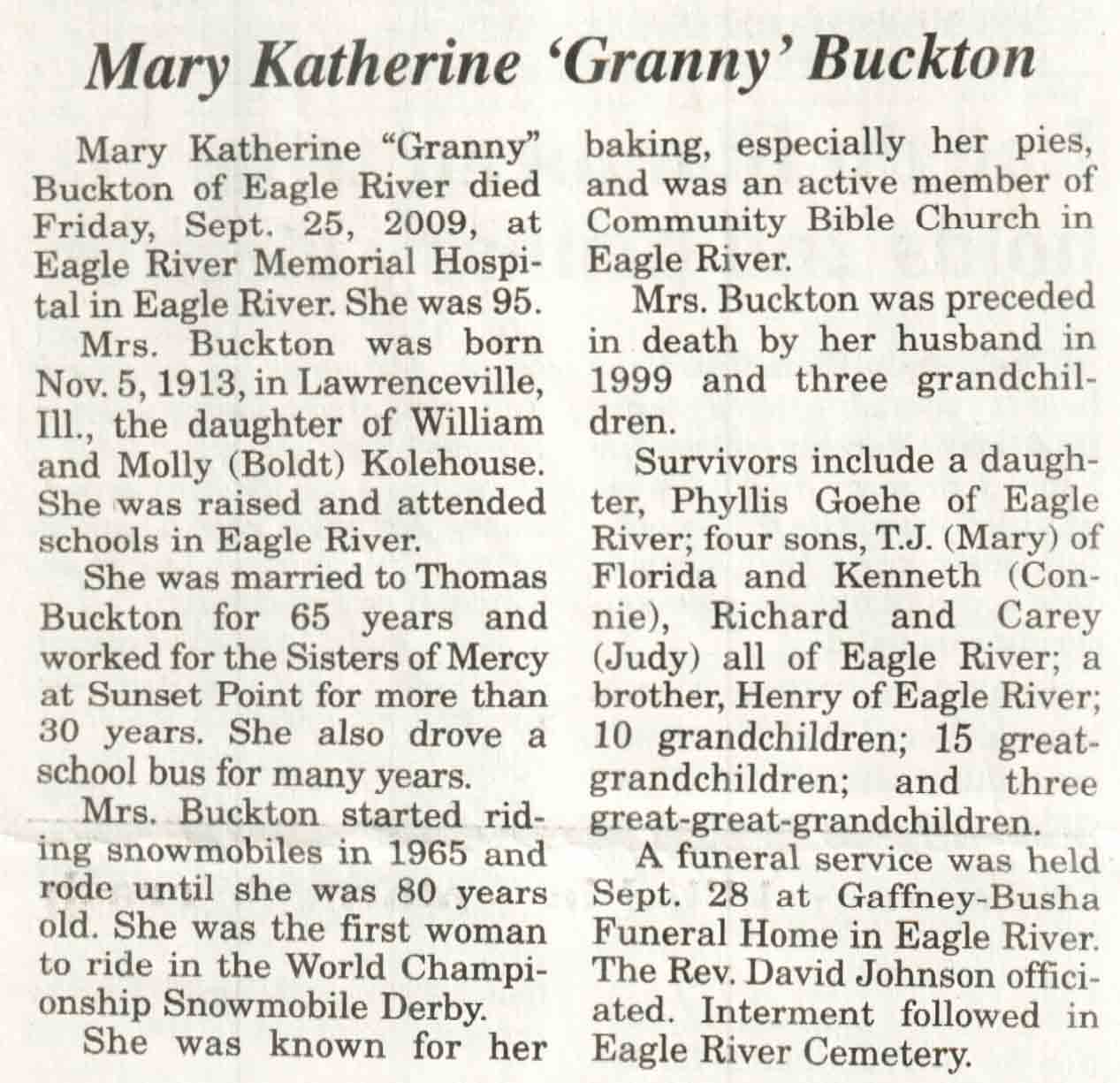 | Buckton | Mary Katherine 'Granny' (Kolehouse) | 05 Nov 1913 | 25 Sep 2009 | V N-R | 30 Sep 2009 | 4A |