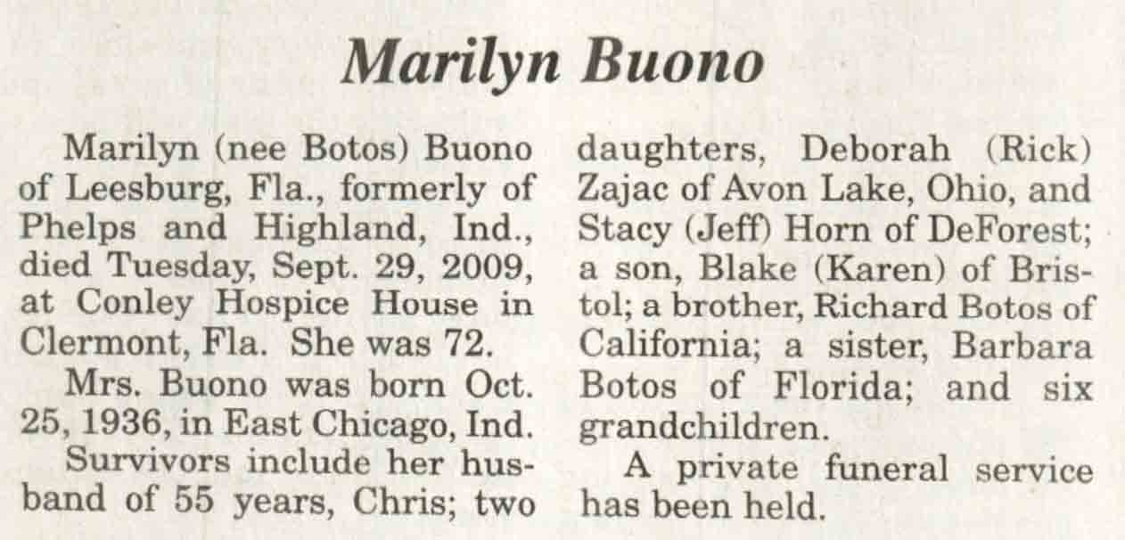 | Buono | Marilyn (Botos) | 25 Oct 1936 | 29 Sep 2009 | V N-R | 07 Oct 2009 | 4A |