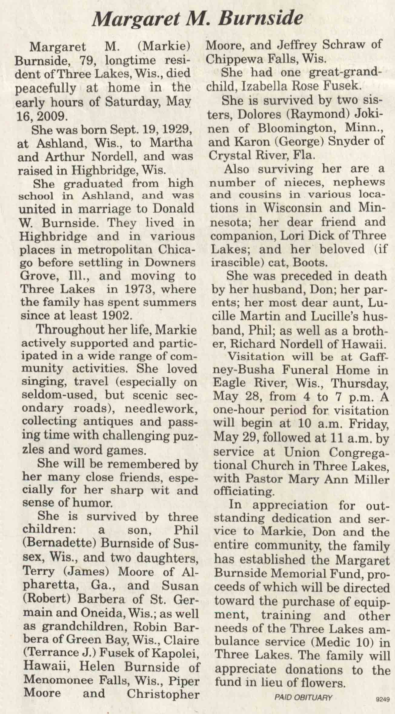 | Burnside | Margaret M (Nordell) | 19 Sep 1929 | 16 May 2009 | V N-R | 27 May 2009 | 4A |
