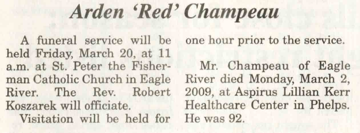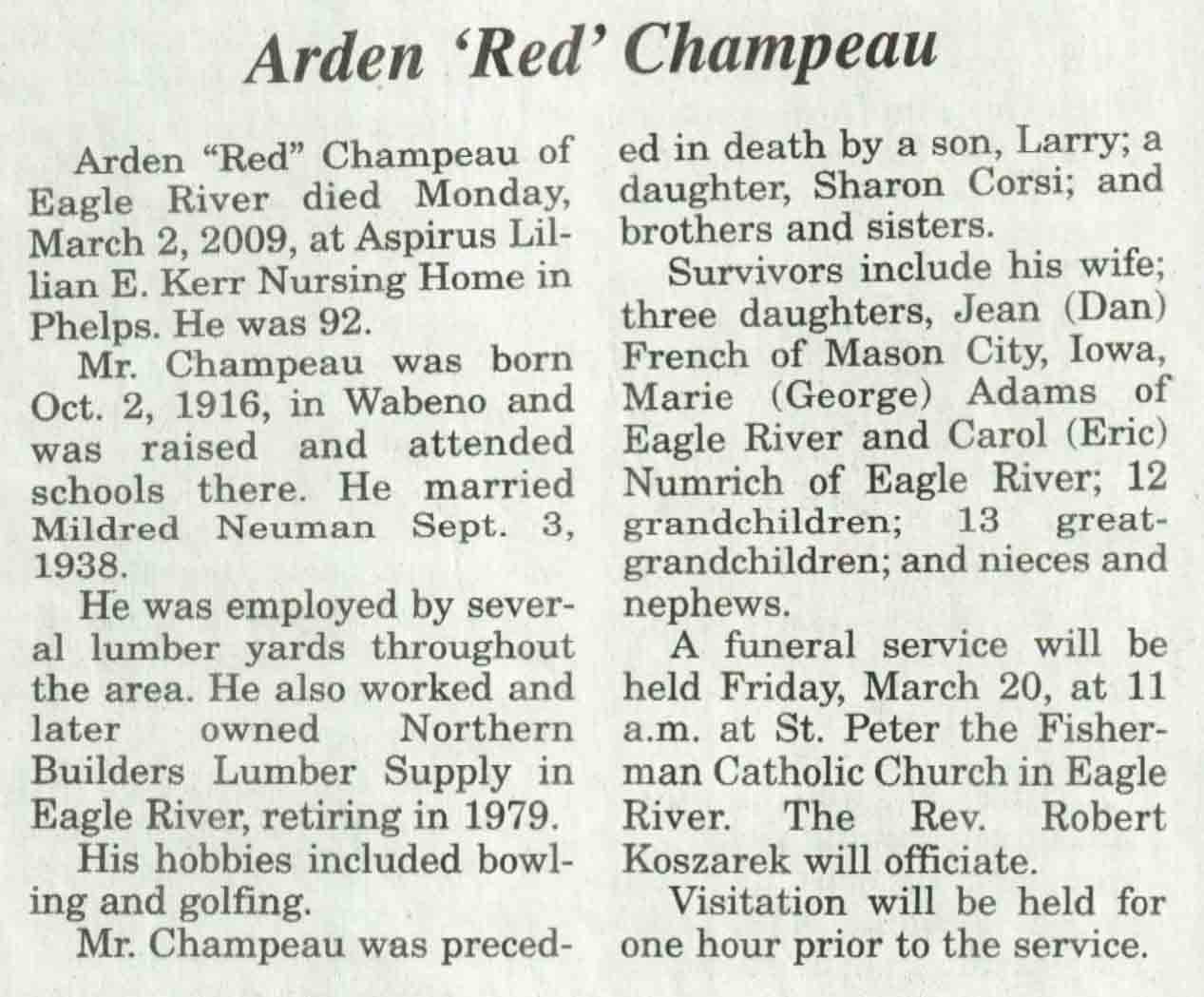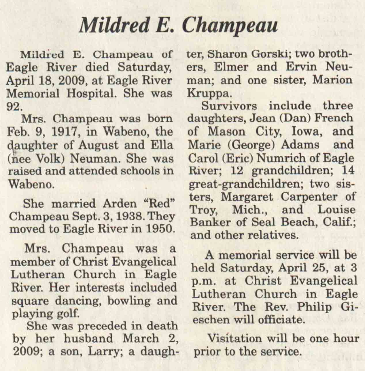| Champeau | Mildred E (Neuman) | 09 Feb 1917 | 18 Apr 2009 | V N-R | 22 Apr 2009 | 4 |
