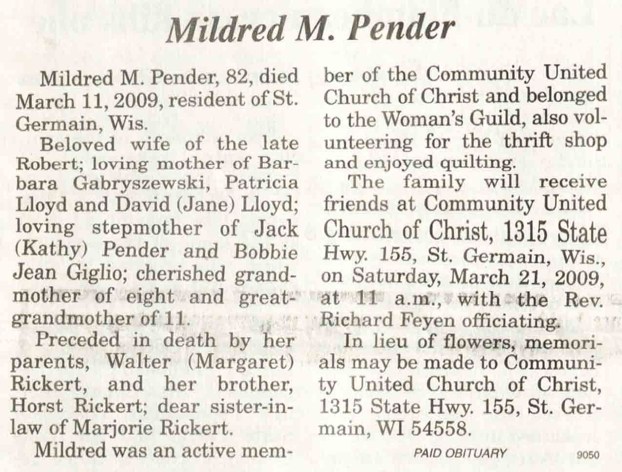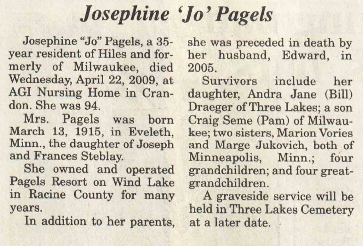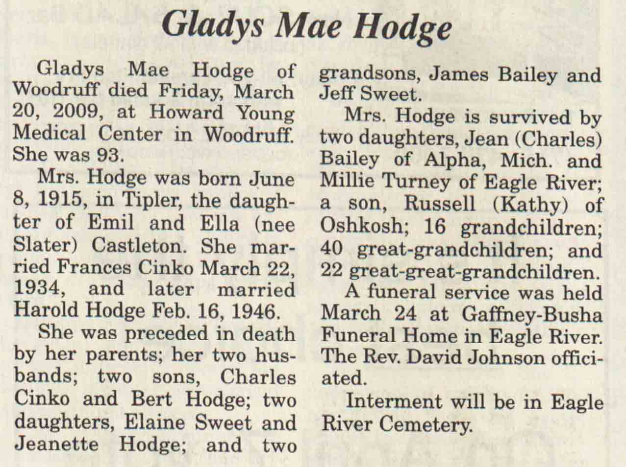 | Champeau | Mildred E (Neuman) | 09 Feb 1917 | 18 Apr 2009 | V N-R | 22 Apr 2009 | 4 |