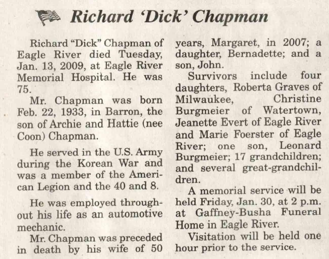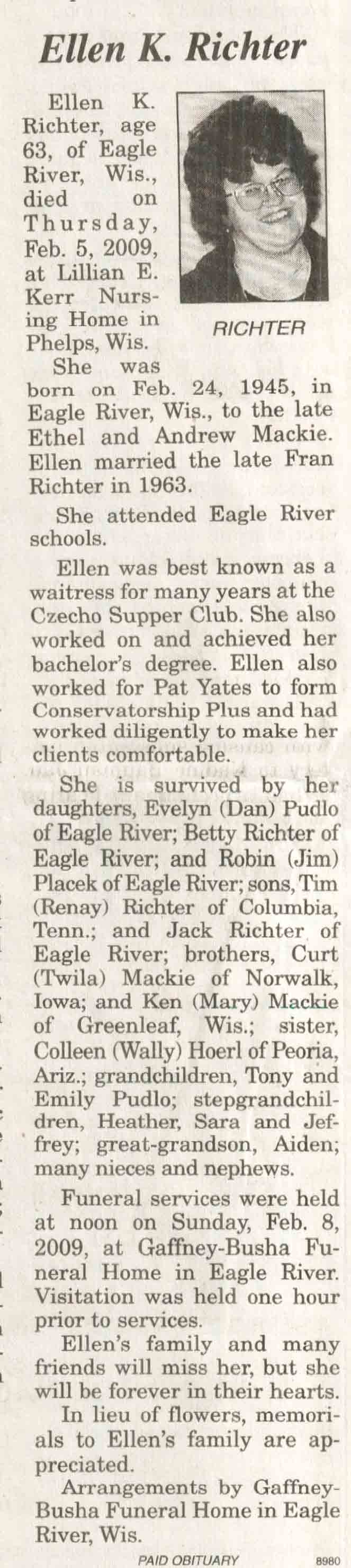 | Richter | Ellen K (Mackie) | 24 Feb 1946 | 05 Feb 2009 | V N-R | 11 Feb 2009 | 4A |