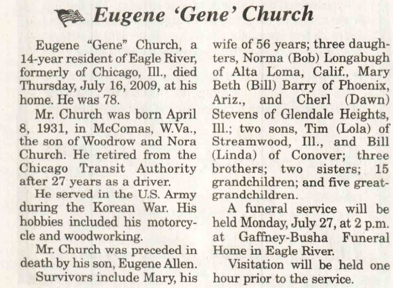 | Church | Eugene 'Gene' | 08 Apr 1931 | 16 Jul 2009 | V N-R | 22 Jul 2009 | 4A |